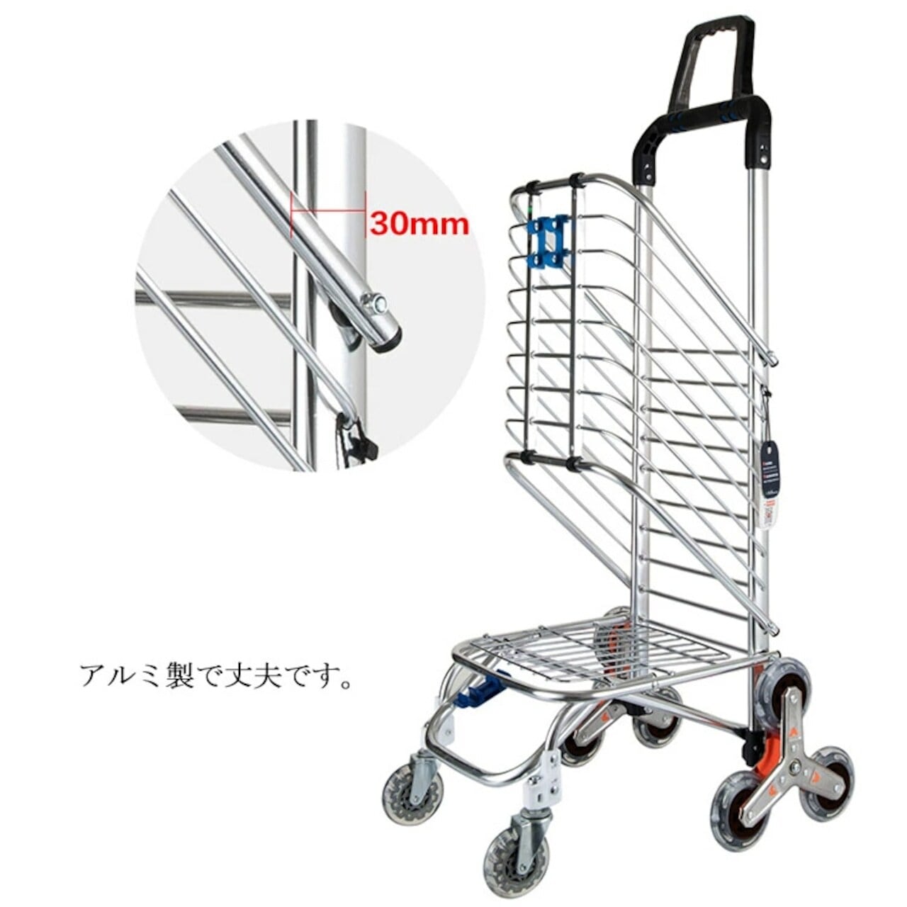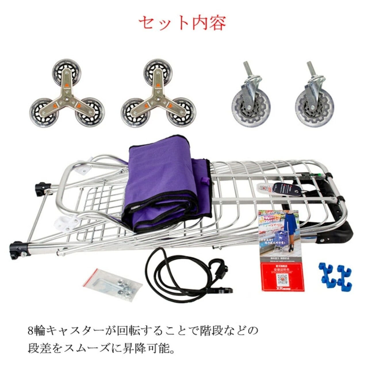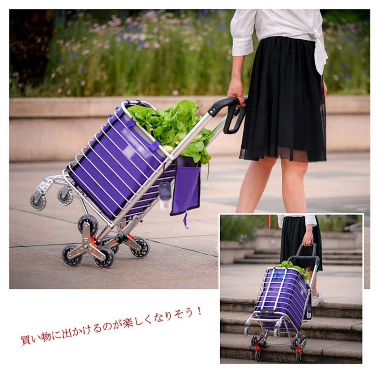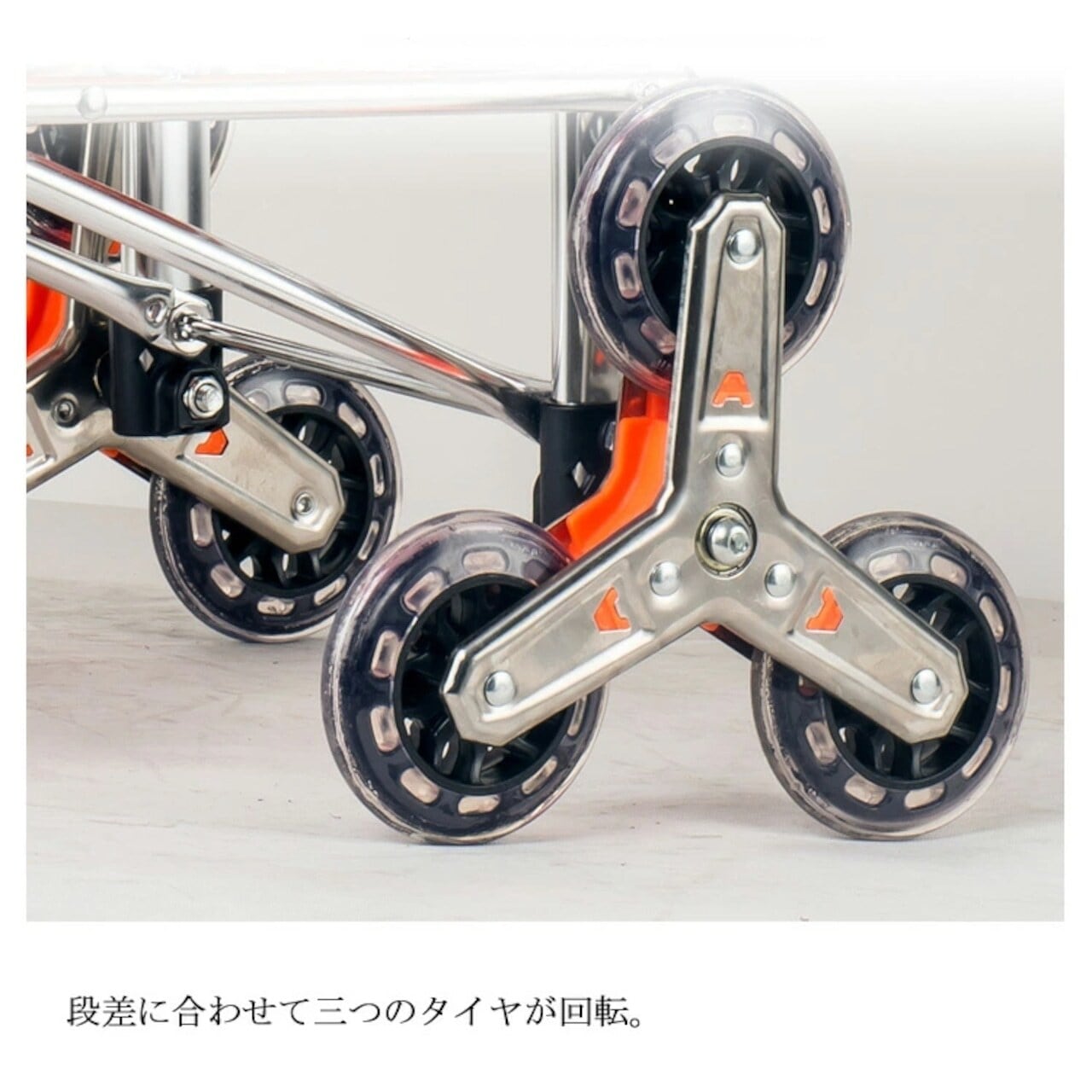 8輪設計の強みは、何と言っても階段対応。通常の4輪カートでは難しい階段も、8輪が段差に合わせて回転しながらスムーズに昇降します。駅の階段やちょっとした段差もストレスフリー。