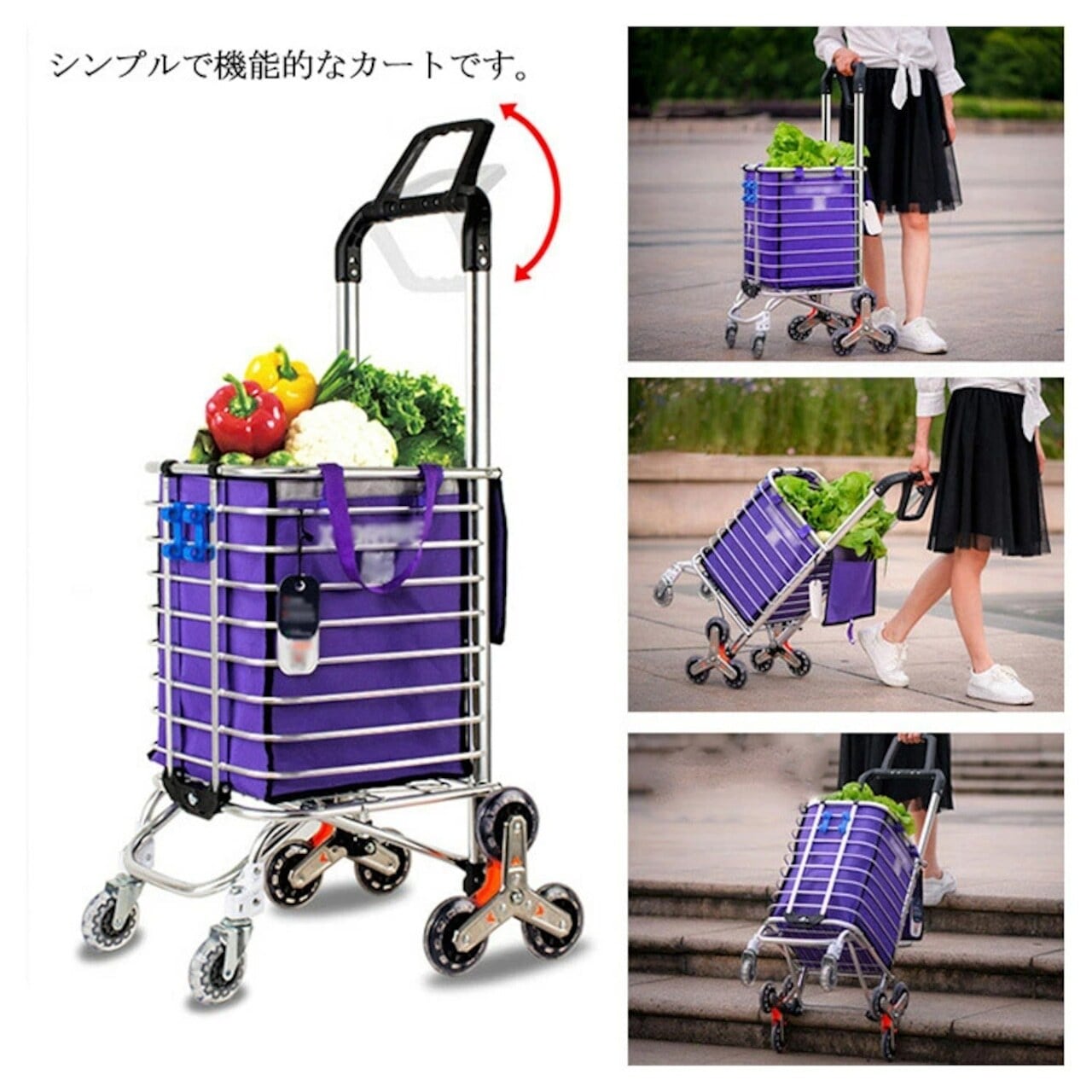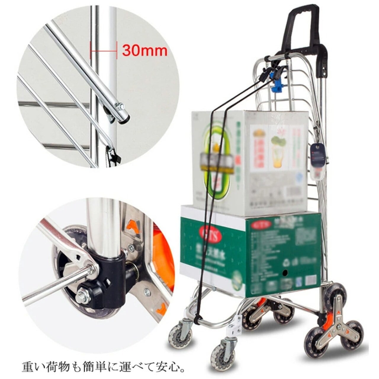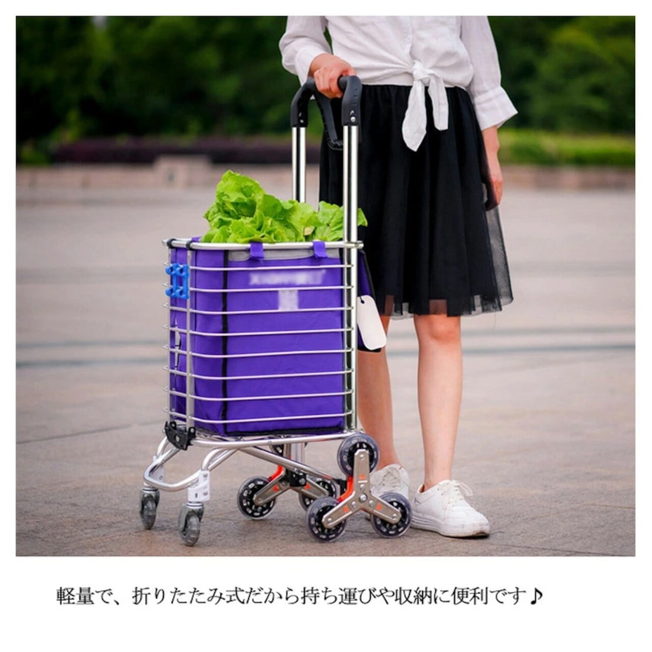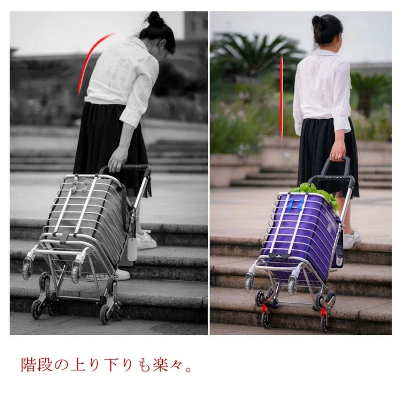 8輪設計の強みは、何と言っても階段対応。通常の4輪カートでは難しい階段も、8輪が段差に合わせて回転しながらスムーズに昇降します。駅の階段やちょっとした段差もストレスフリー。