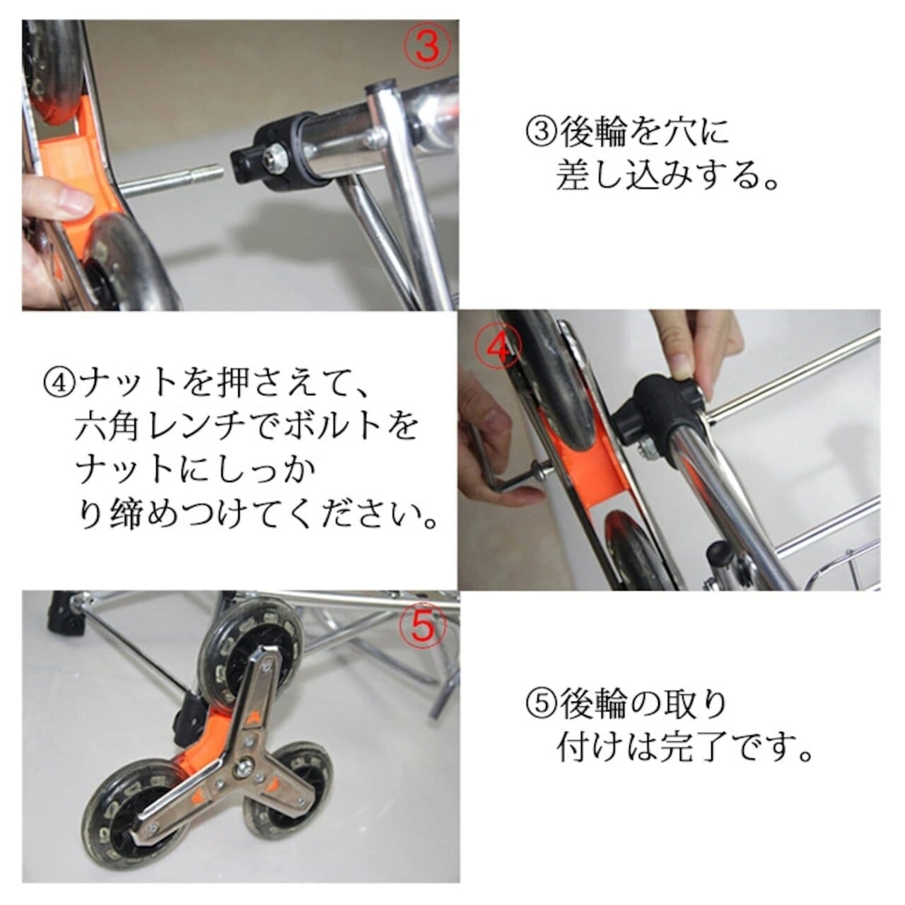 付属の六角レンチを使って、後輪を取り付けるだけの簡単設計。説明書を見ながら、お一人で組み立てられます。