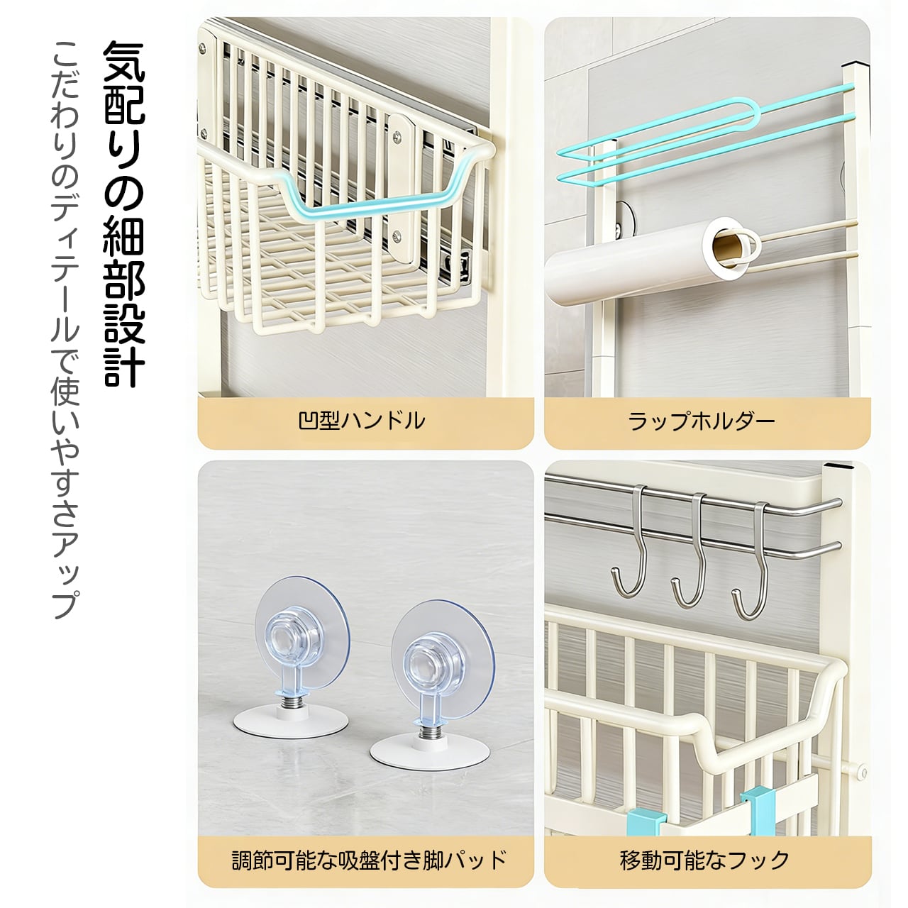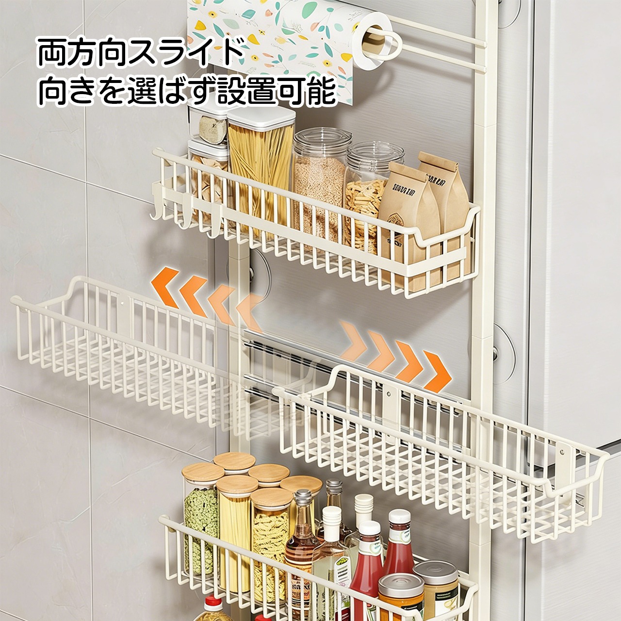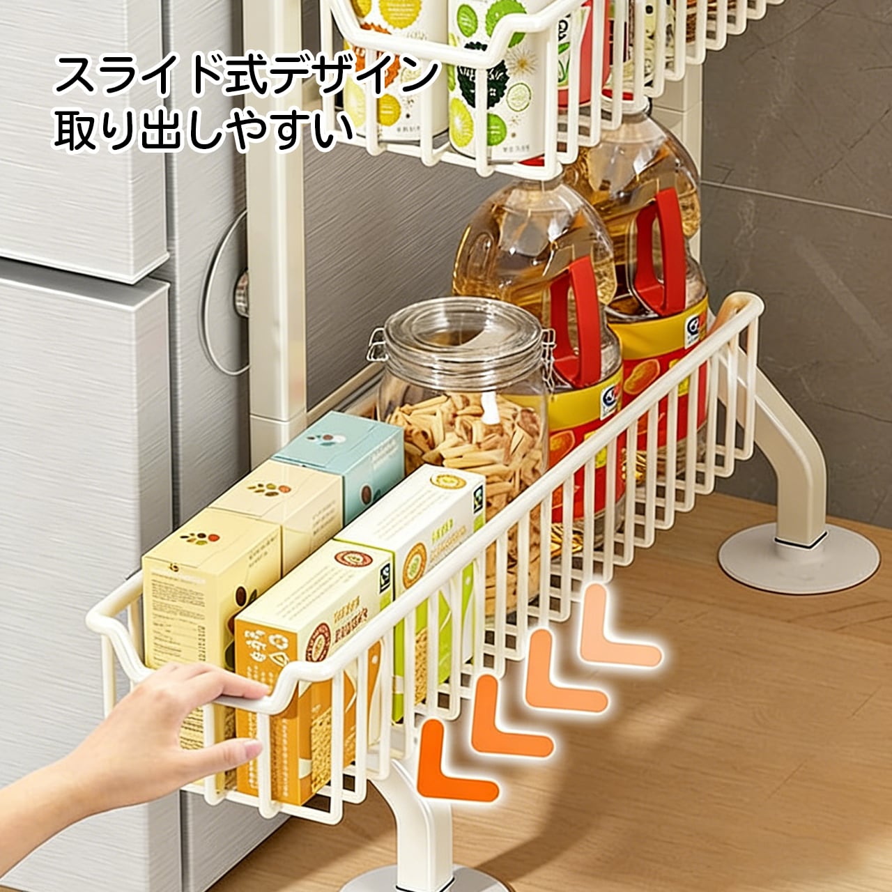 J07 .冷蔵庫横スリム収納ラック|壁に寄せて設置|多段調味料・キッチン小物整理棚|工具不要・挟むだけ設置
