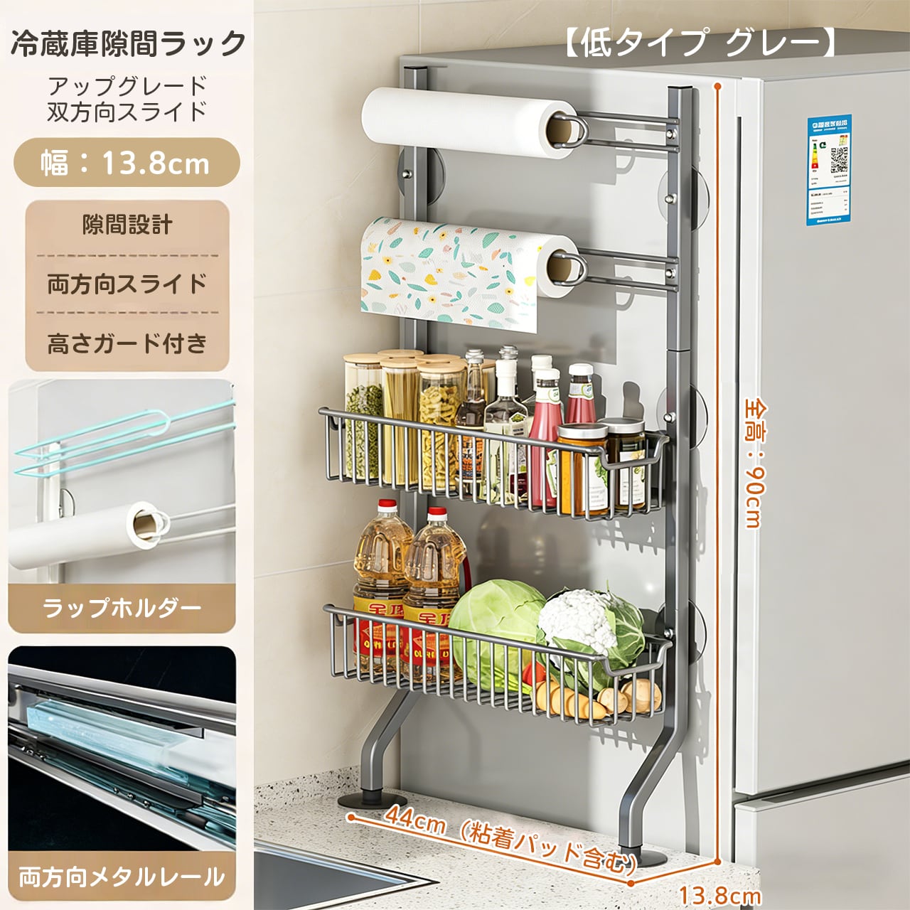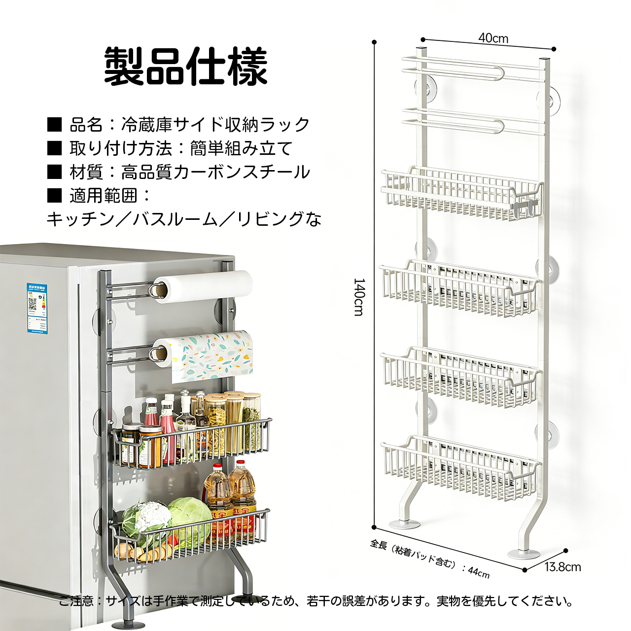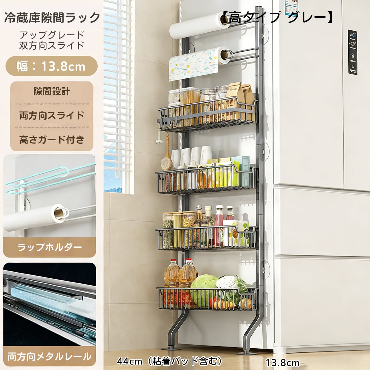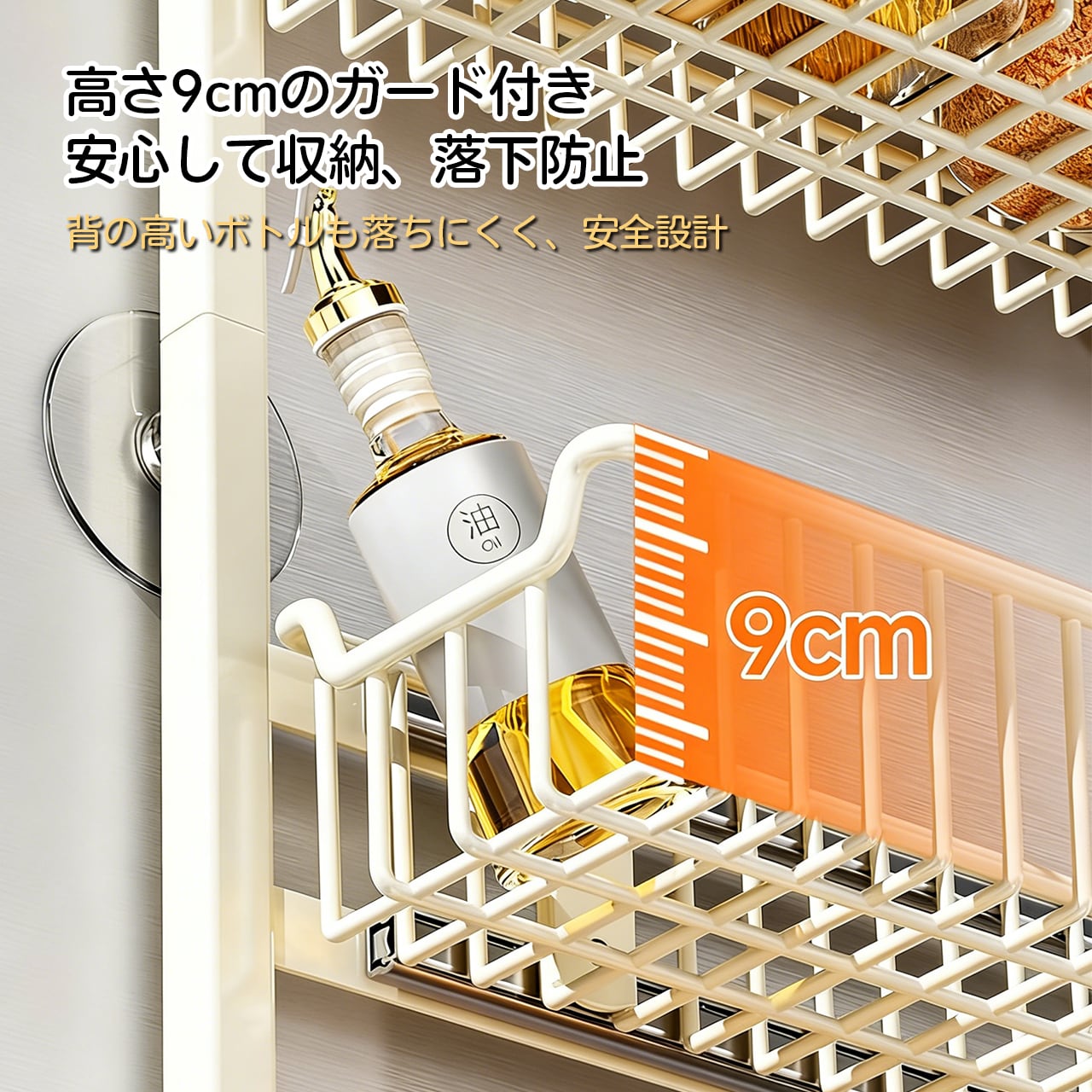 J07 .冷蔵庫横スリム収納ラック|壁に寄せて設置|多段調味料・キッチン小物整理棚|工具不要・挟むだけ設置