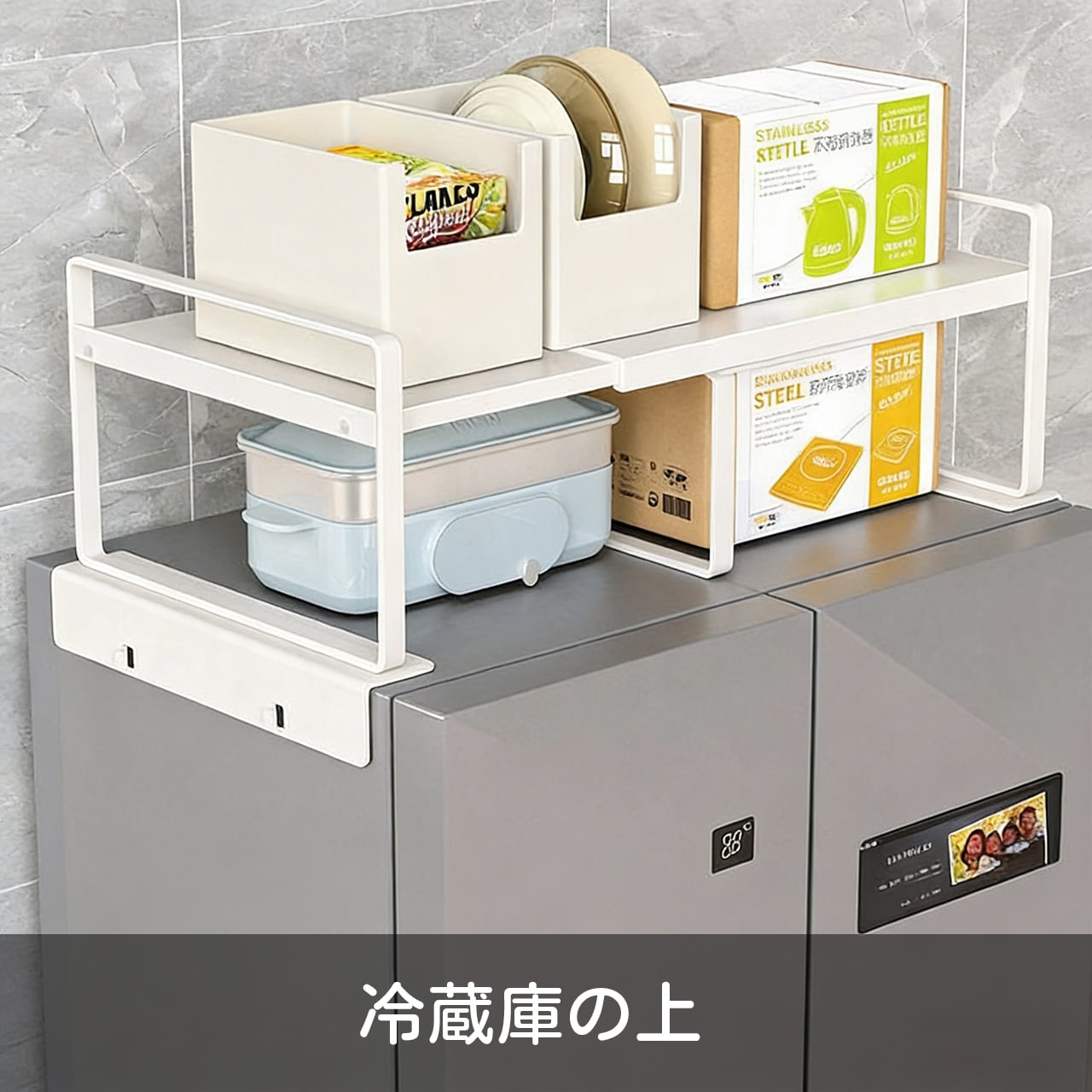 冷蔵庫、洗濯機、電子レンジの上など、使われていないスペースを最大限に活用できる収納セットです。キッチン、バスルーム、ランドリー、オフィスなど、様々な場所で利用可能。