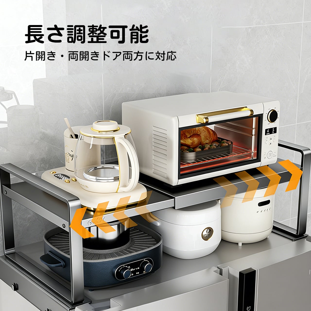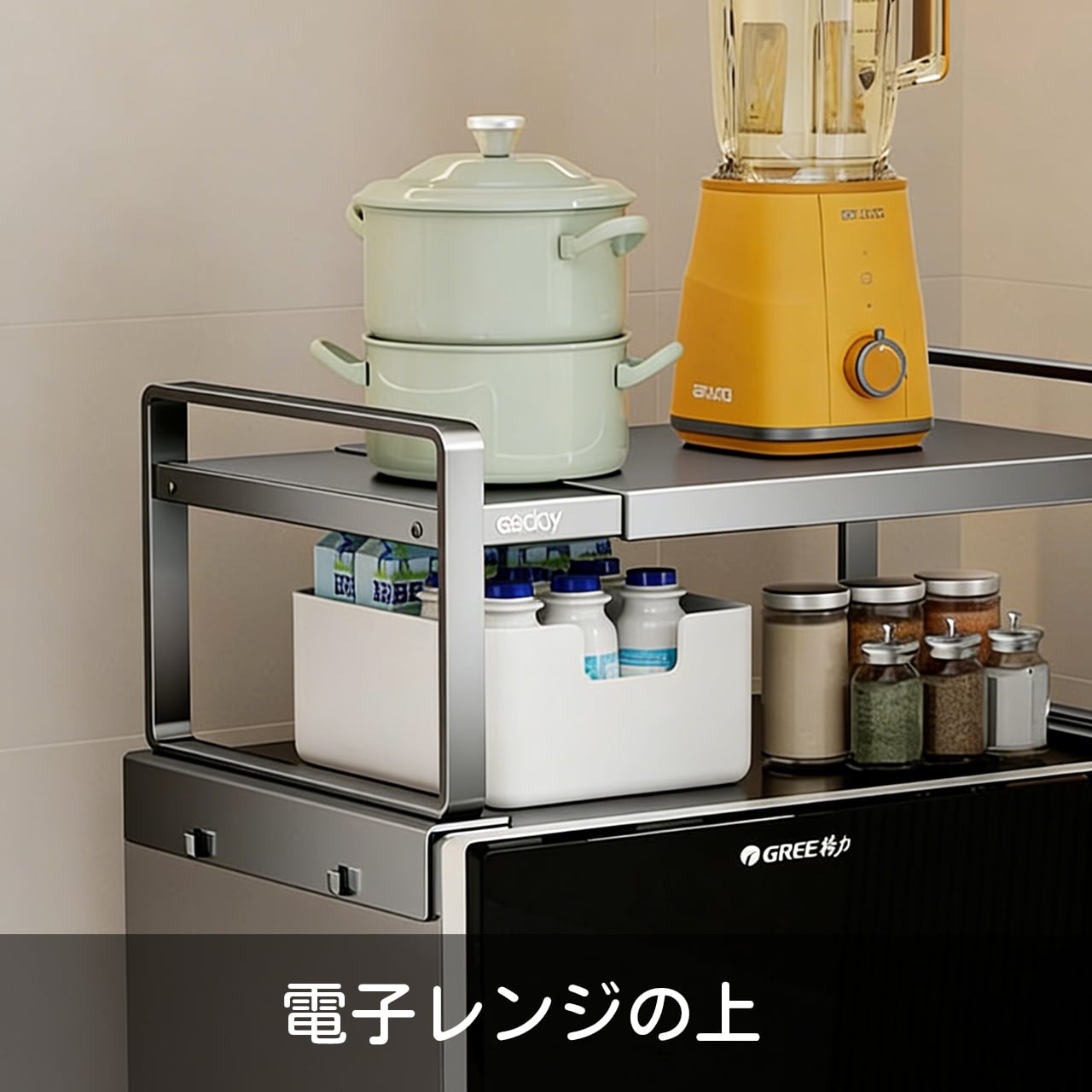 電子レンジの上に置いて、調味料や器具、小物などを整然と収納。キッチンでの作業が効率的になります。