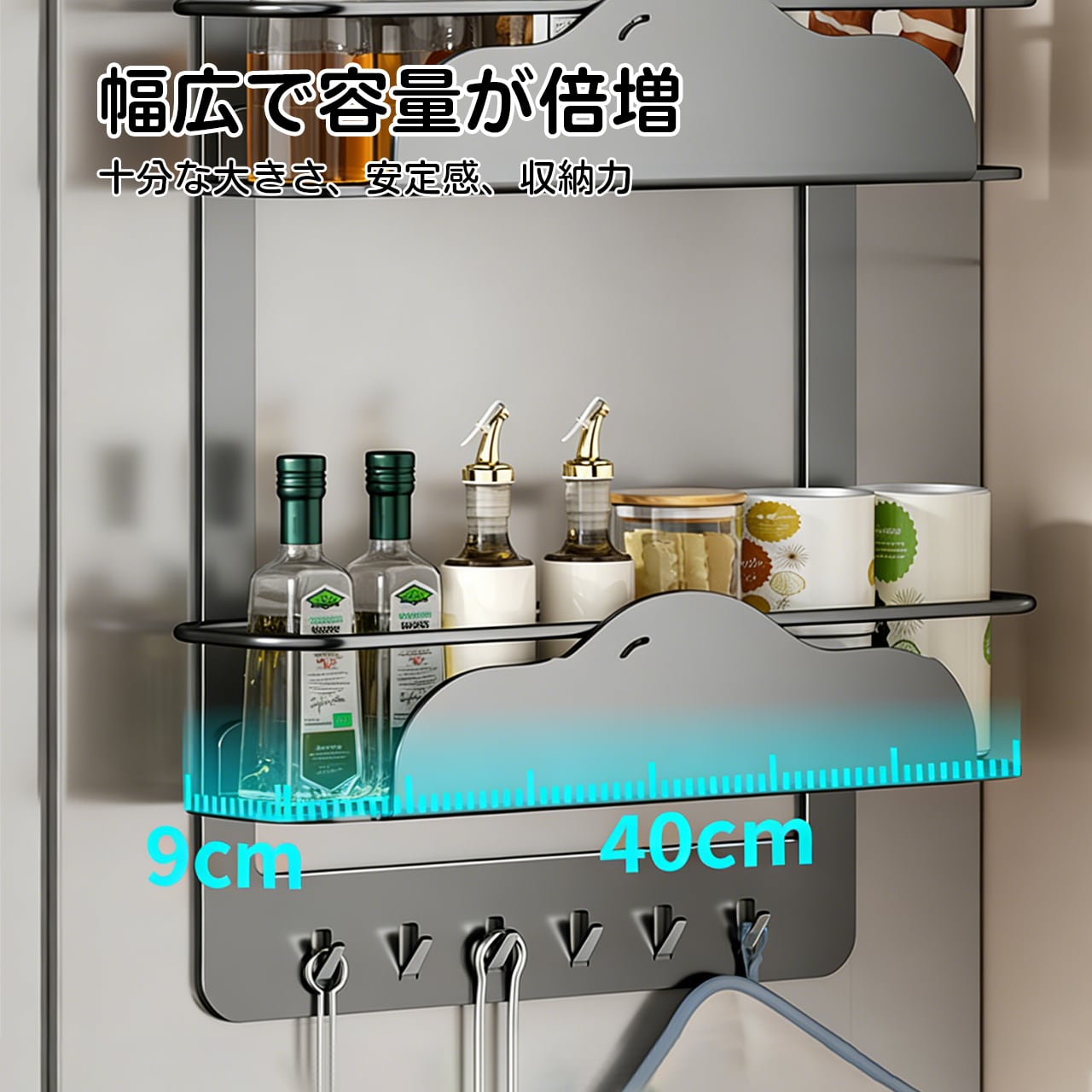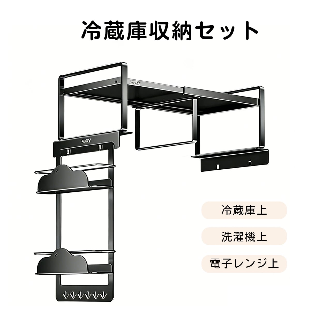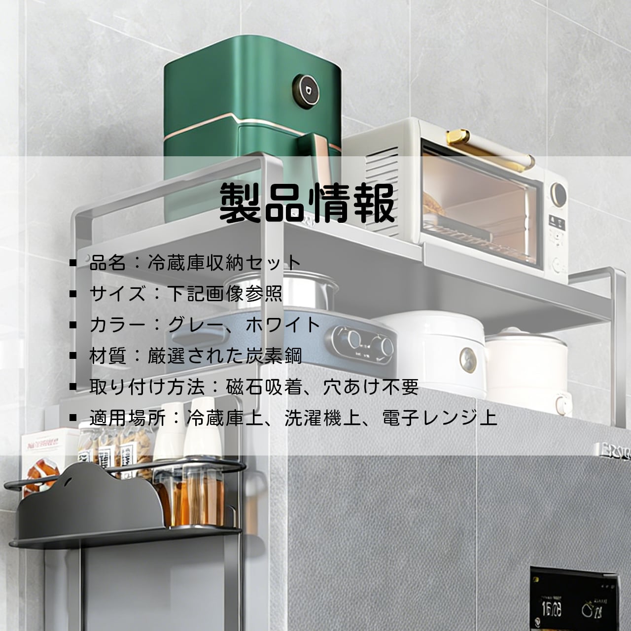 冷蔵庫上、洗濯機上、電子レンジ上の空間を効率的に使うための最適な収納ソリューションです。この収納セットで、あふれたキッチン用品や小物を簡単に整理でき、キッチンや洗濯エリアがすっきりと広く感じられます。強力な磁石吸着で、設置も簡単、どんな場所にもぴったりフィットします。