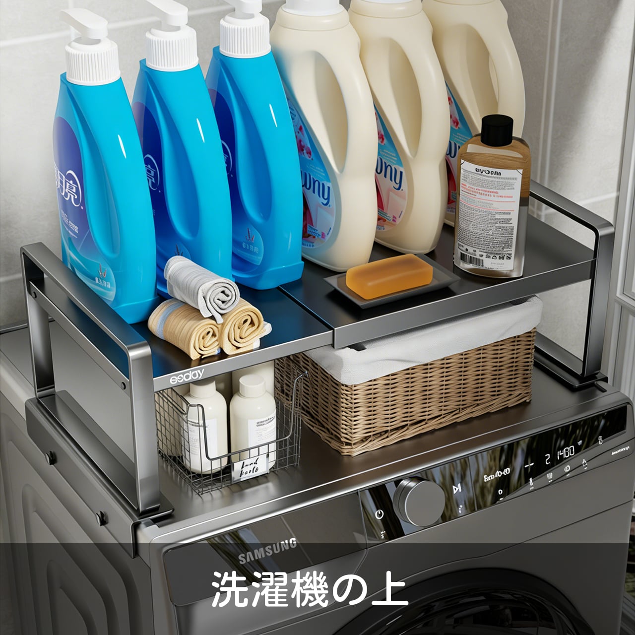 洗濯機上に設置して、洗濯洗剤や柔軟剤、タオルなどを整理できます。見た目もスッキリ、使いやすさも抜群。