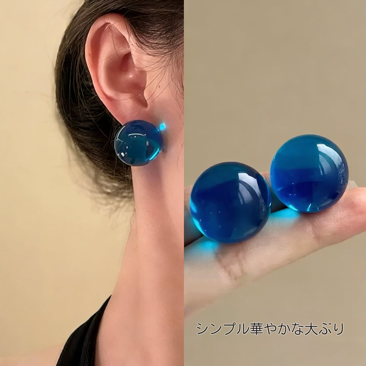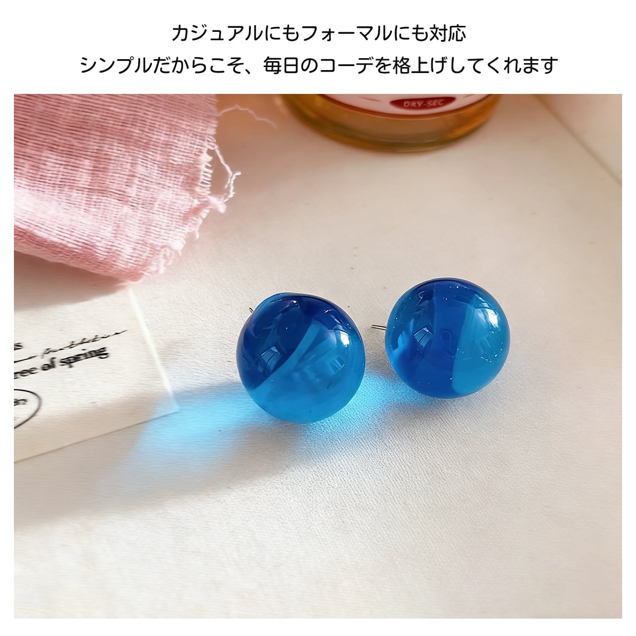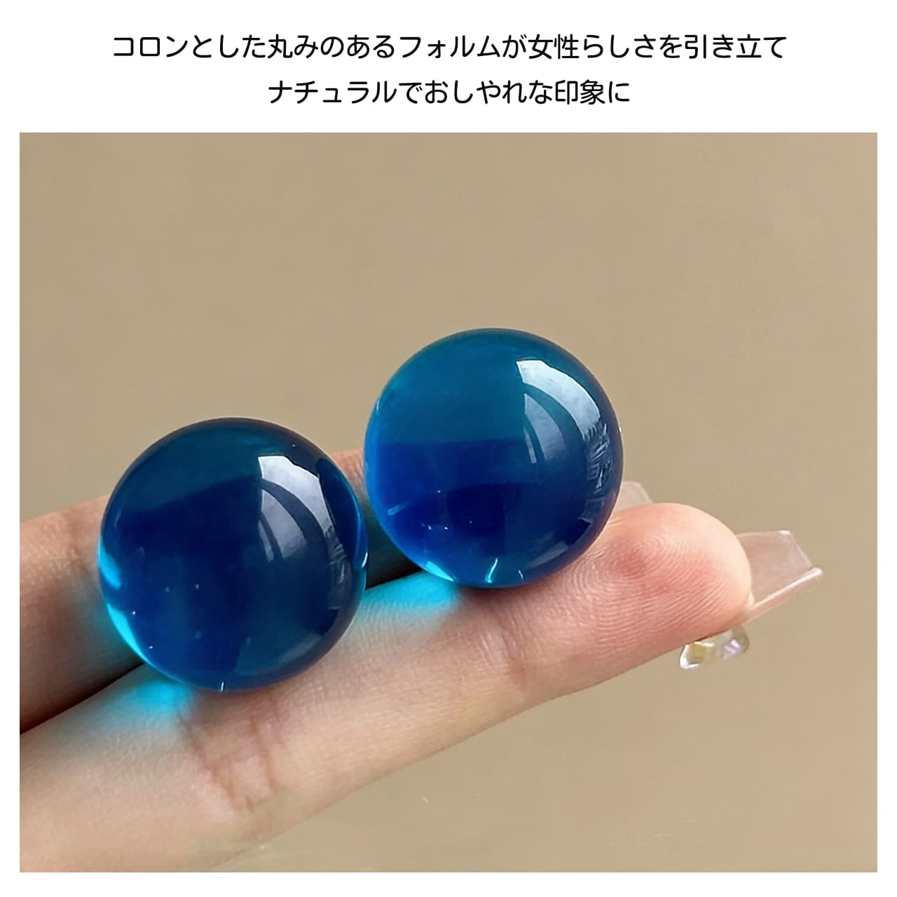 清透感のある大きめの丸珠で、耳元で光を受けるとキラキラ輝きます。顔周りを華やかに演出し、写真映えも抜群。