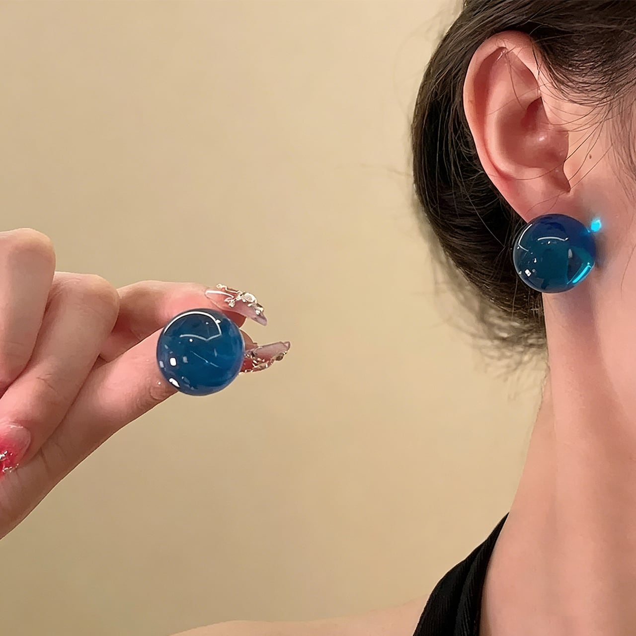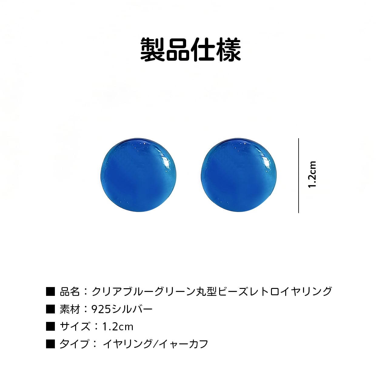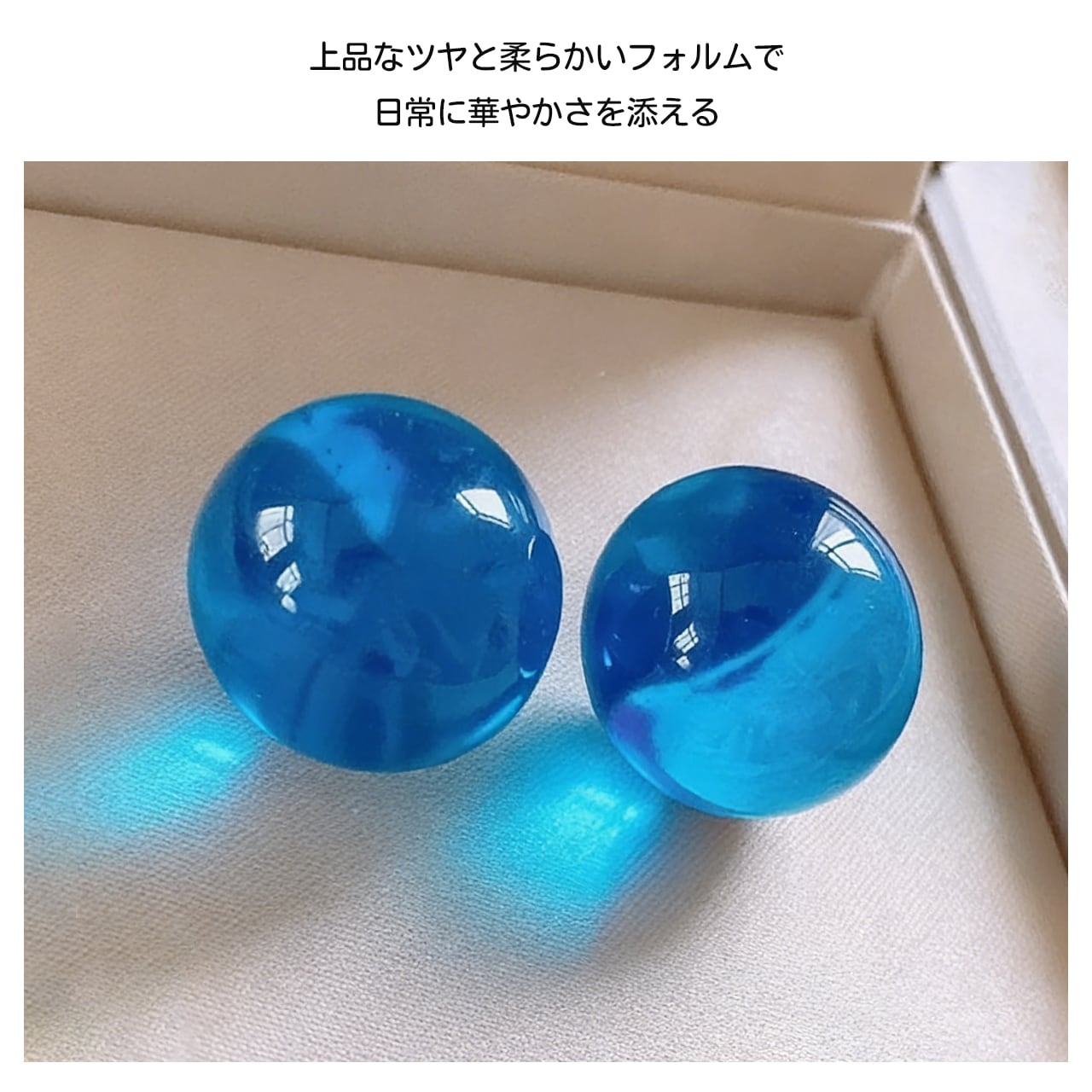 清透感のある大きめの丸珠で、耳元で光を受けるとキラキラ輝きます。顔周りを華やかに演出し、写真映えも抜群。