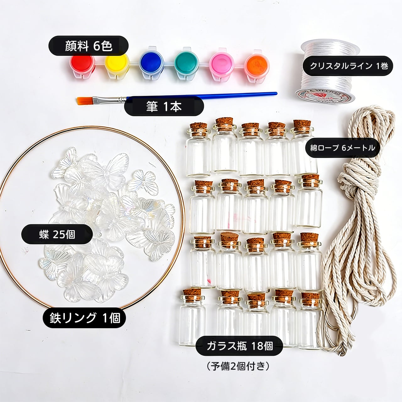 ✅ 豊富な素材:6色の絵具、25匹の蝶、1個の鉄リング、18個のガラス瓶(2個の予備付き)など、すべての素材が揃っています。