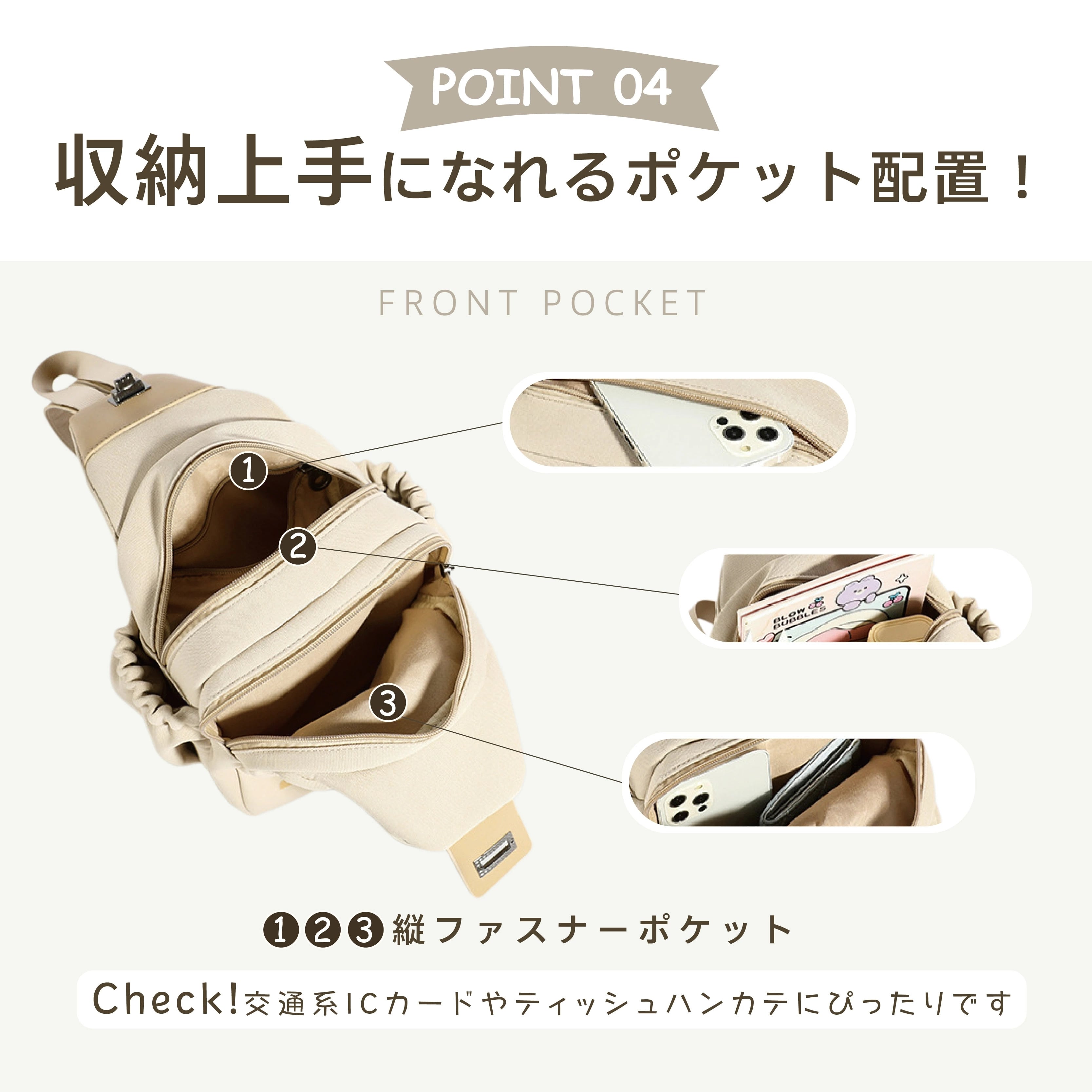 縦ファスナーポケット ×3(交通系ICカード・ティッシュ・ハンカチに便利)