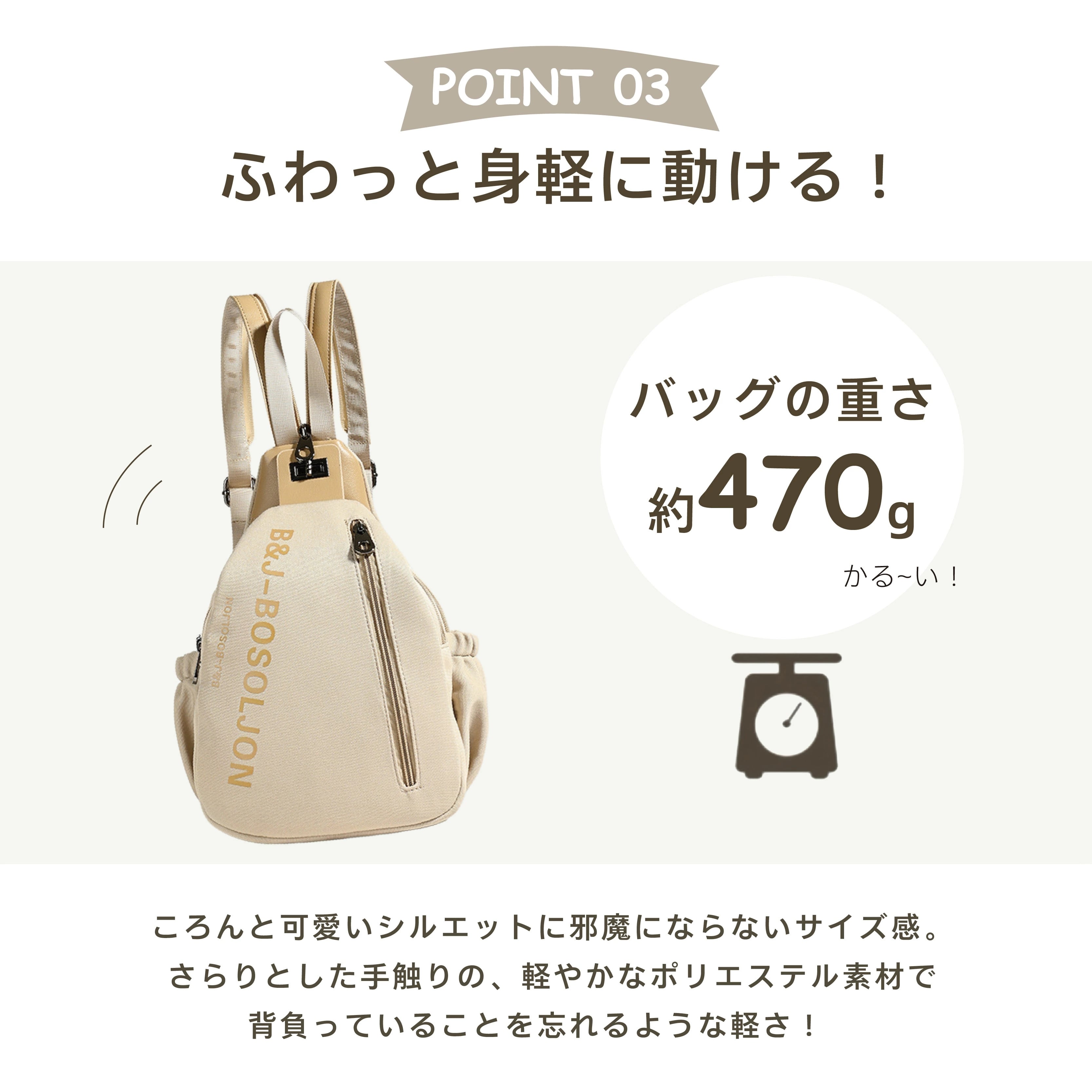 約470gの軽量設計。さらりとした手触りの軽やかなポリエステル素材で、背負っていることを忘れるような軽さです。ころんと可愛いシルエットで、邪魔にならないサイズ感も魅力。