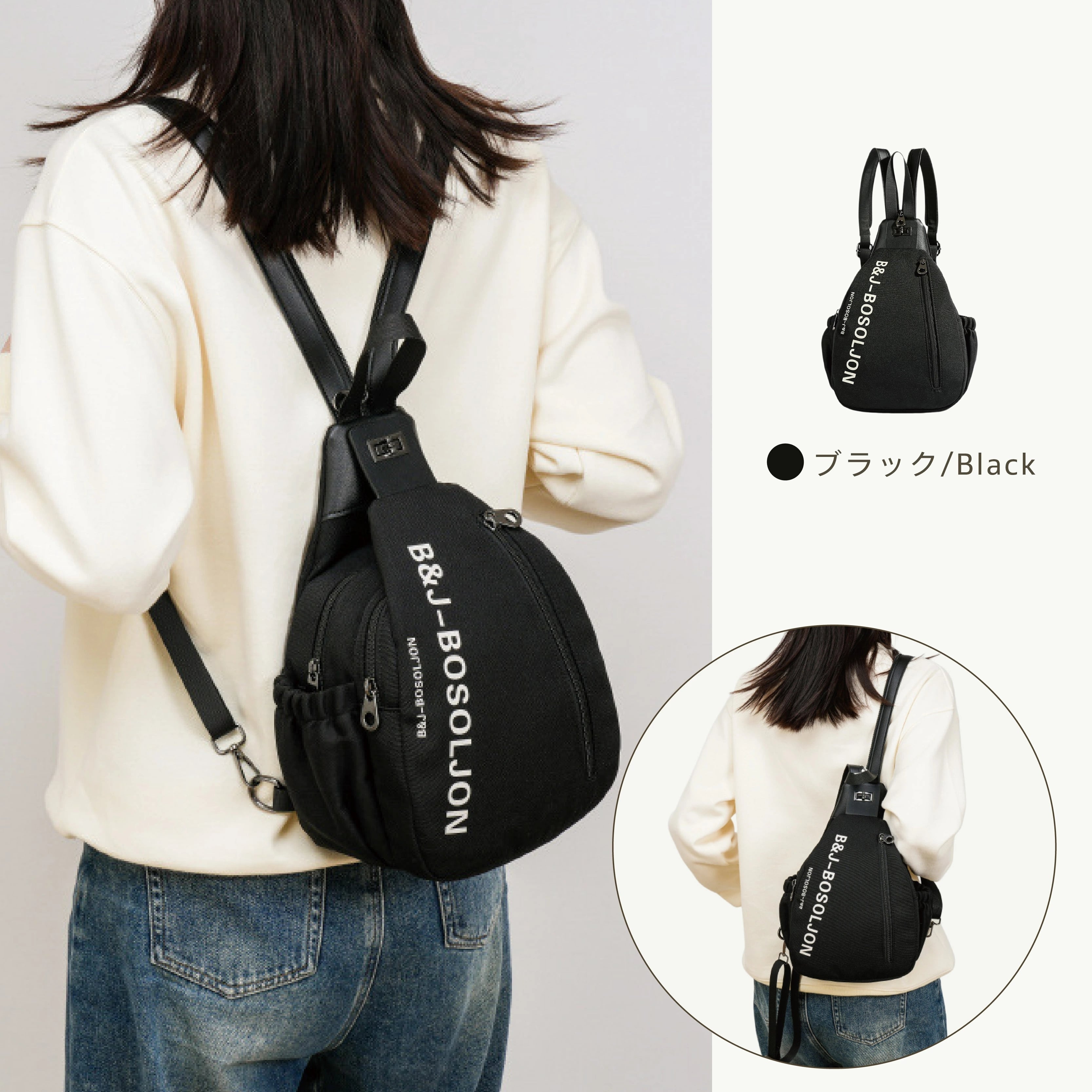 ショルダー部分のファスナーを閉めるとボディバッグ、開けるとリュックに変身。さらにベルトを調節するだけで斜めがけとしても使えます。ベルトは左右どちらにも付け替えでき、簡単&自由にスタイルチェンジ!