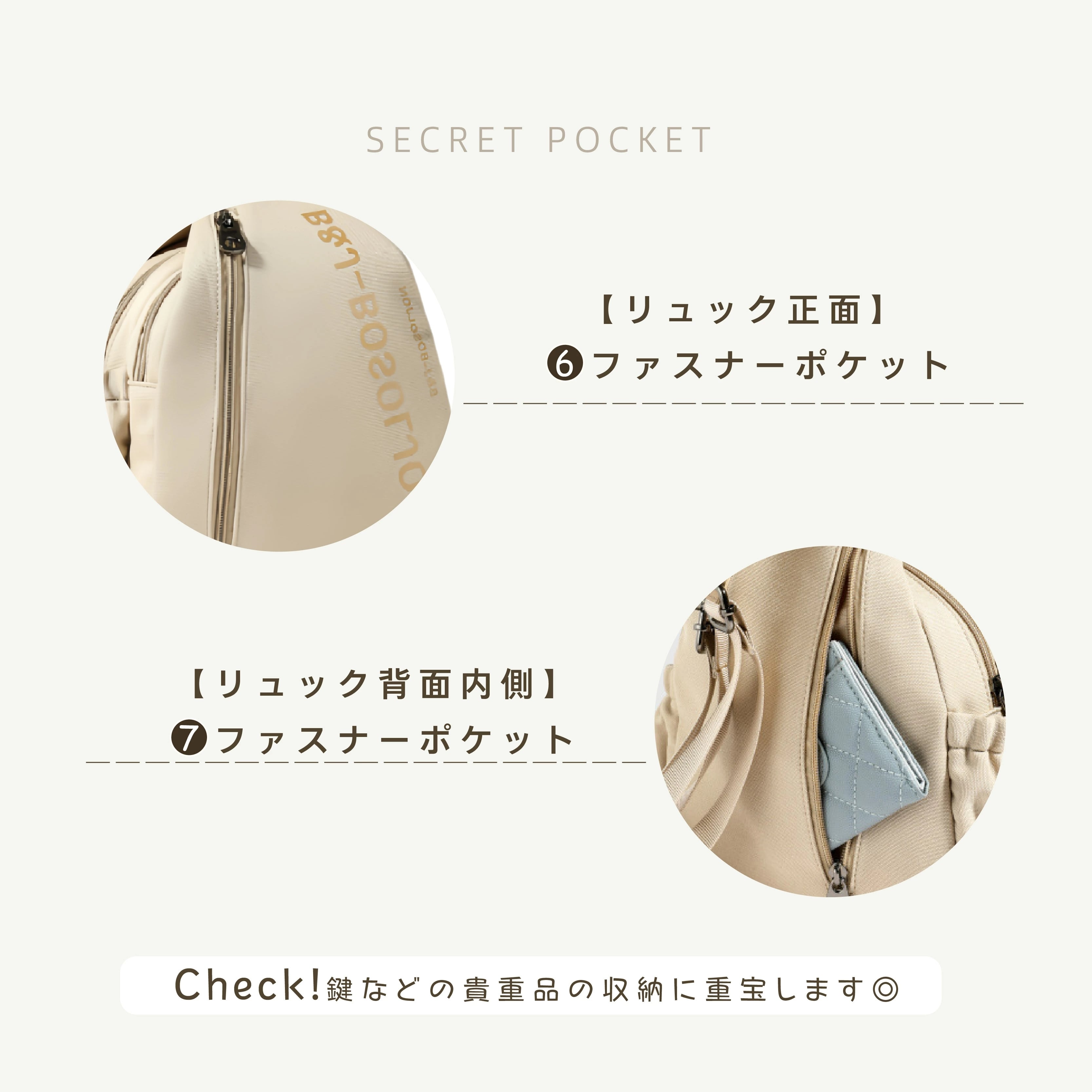 ファスナーポケット ×1(リュック背面内側・鍵などの収納に)