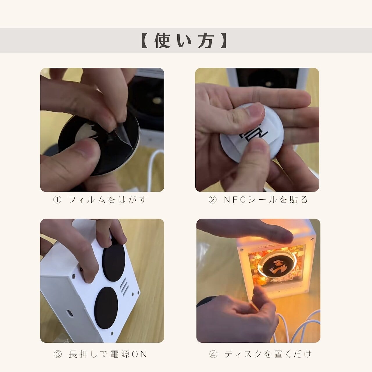 NFC対応のアルバムプレーヤーです。専用ディスクを本体に置くだけで、音楽が再生されます。