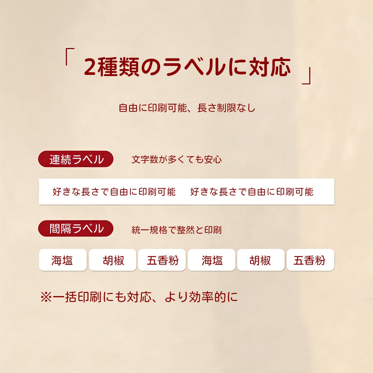 家庭での食品ラベル、子ども用品の整理、オフィスでの書類管理、イベント用タグなど、幅広いシーンで活躍。文字サイズやスタイルも自由に設定可能。