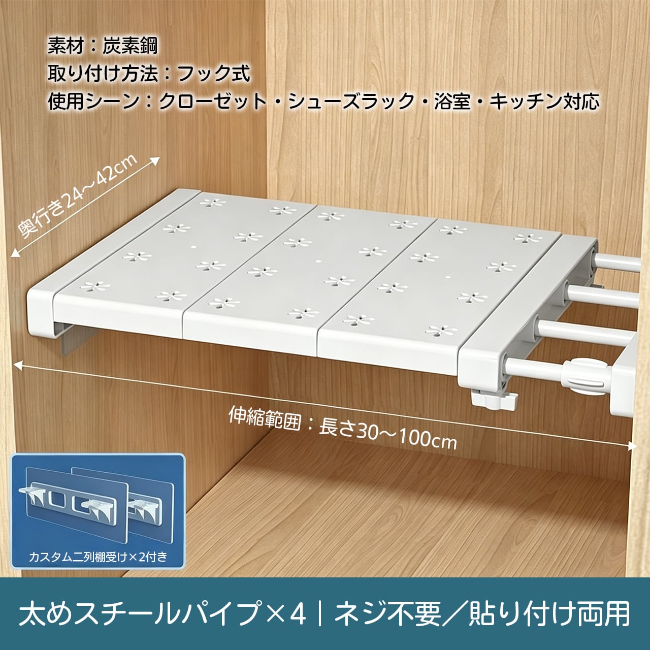 長さ30〜100cm、奥行き24〜42cmで自由に調整可能。クローゼットや靴棚、キッチン、浴室など、様々な場所にピッタリ設置。