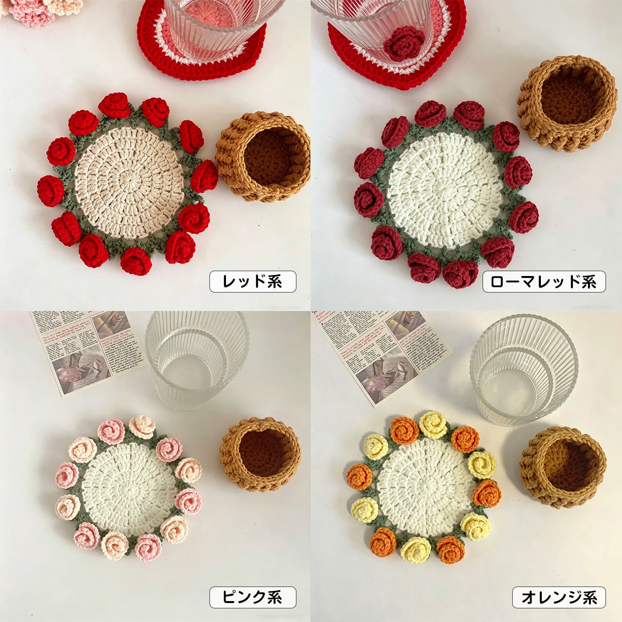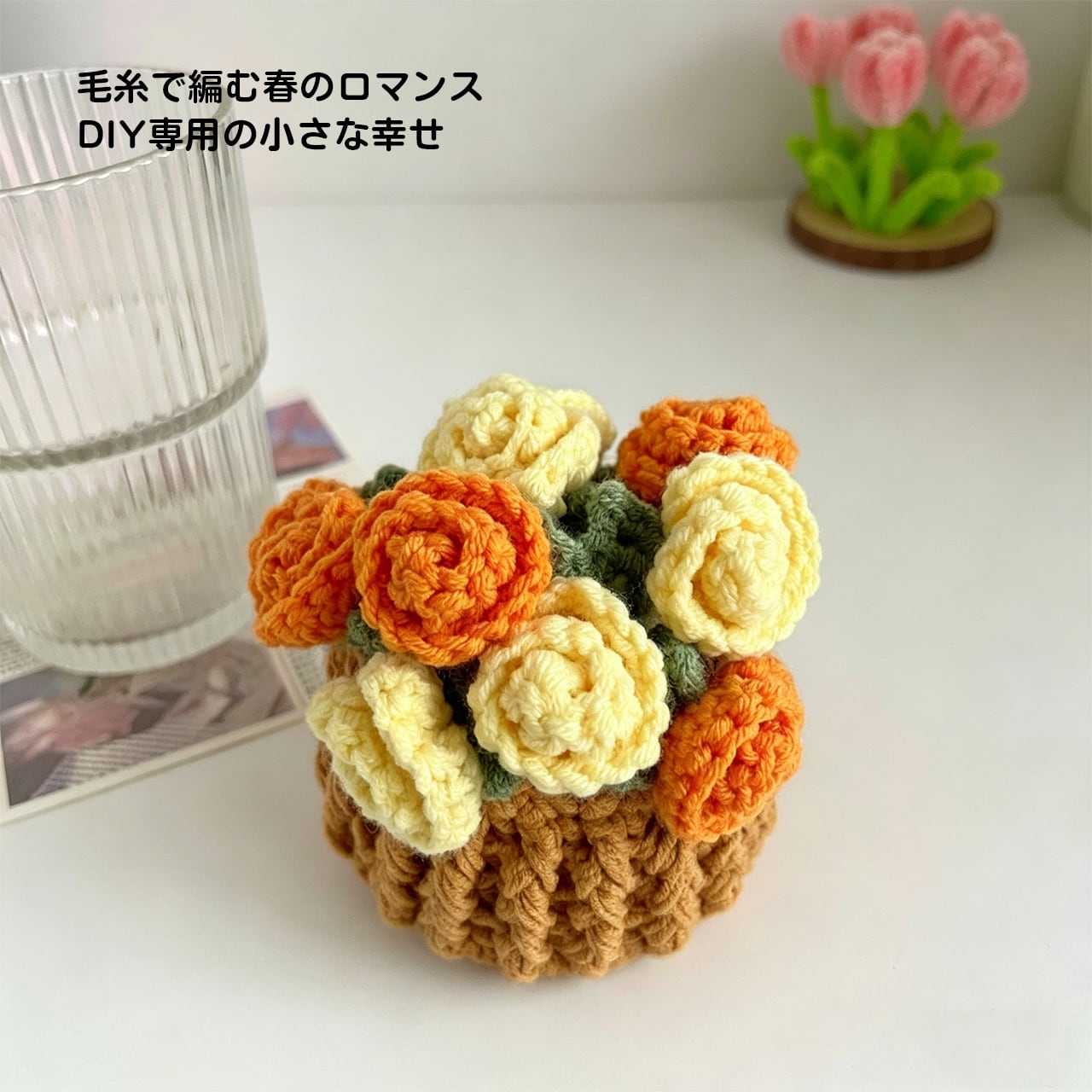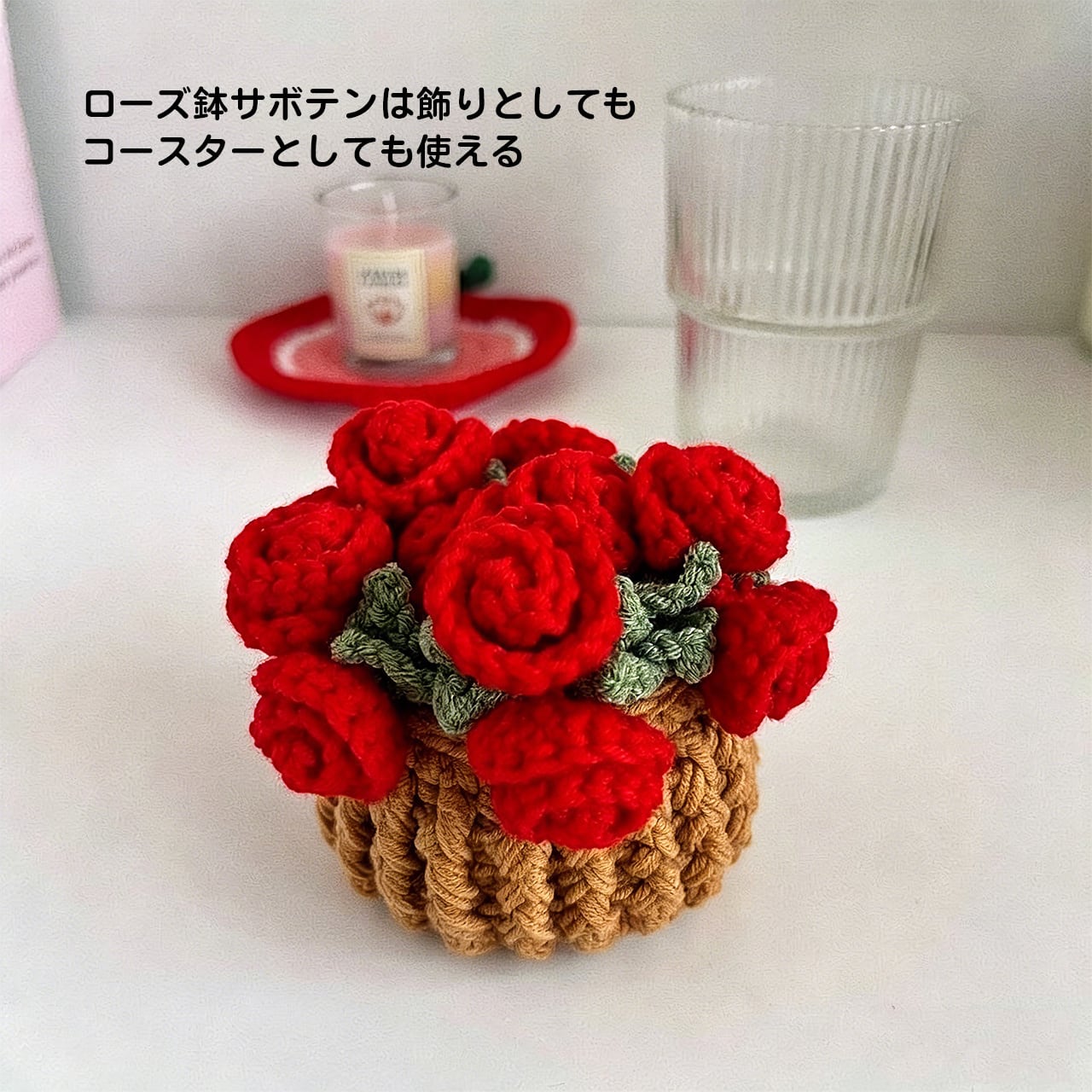Z14 .手編み DIY キット ミニローズ ブーケ コースター 鉢植え かぎ針 毛糸 女の子向け 創作ギフト