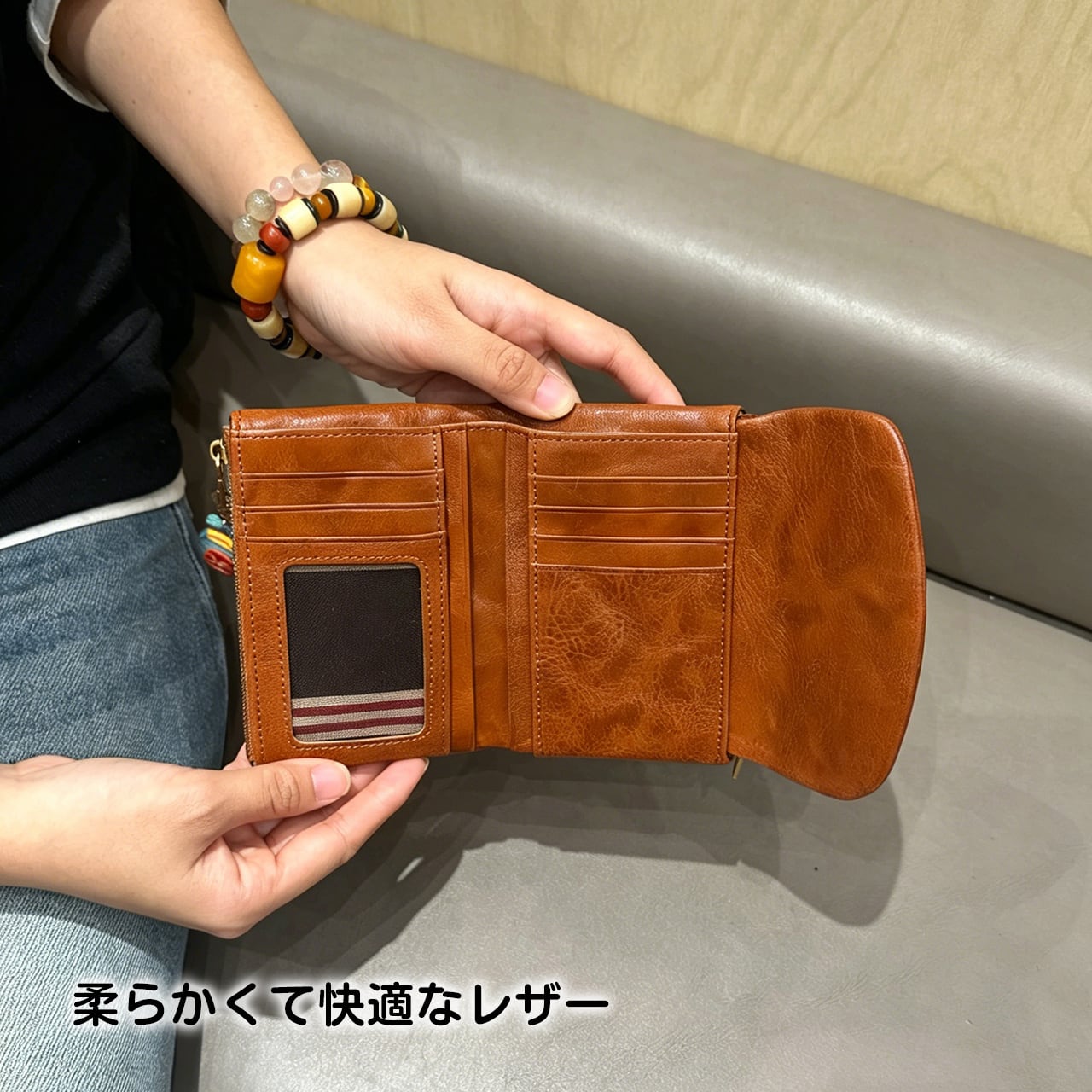 小さいサイズながら、紙幣・カード・レシート・IDなどをしっかり整理できる。手に馴染むサイズで持ち運びもラクラク。