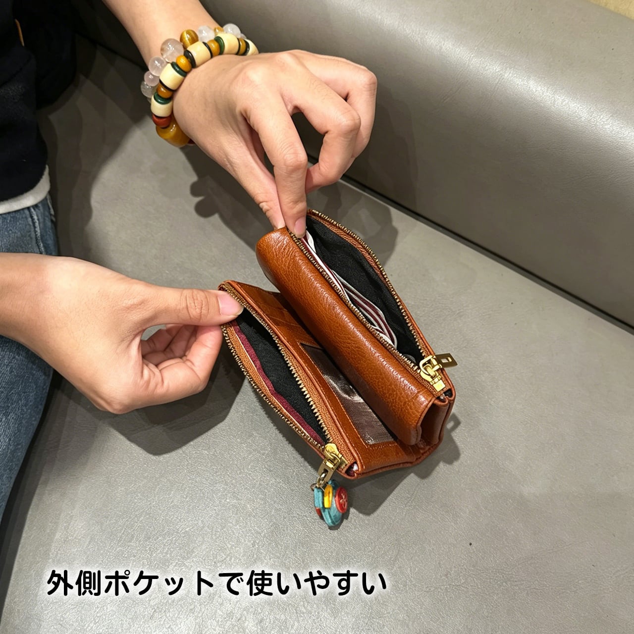 外側ファスナーポケット付きで小物も安全に収納