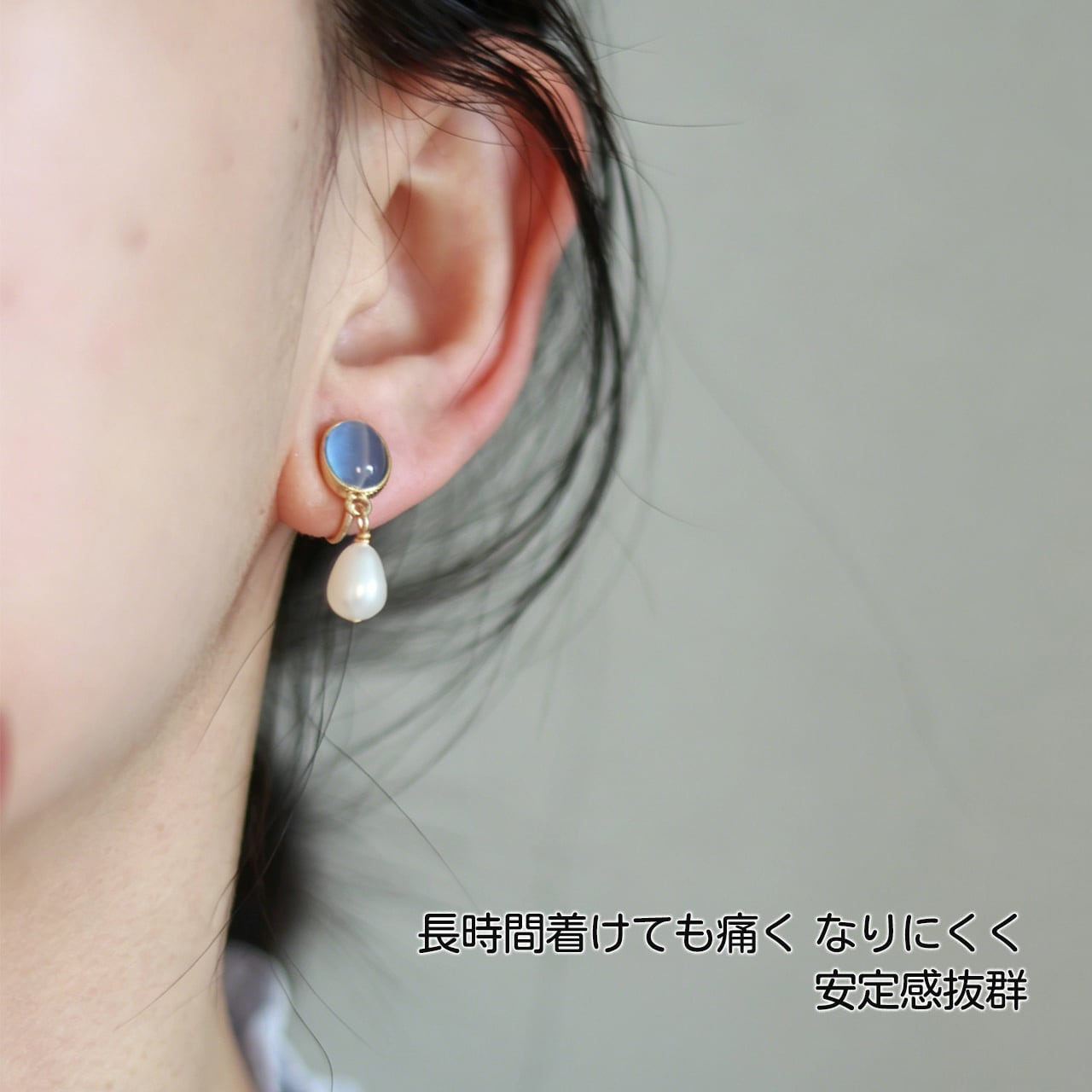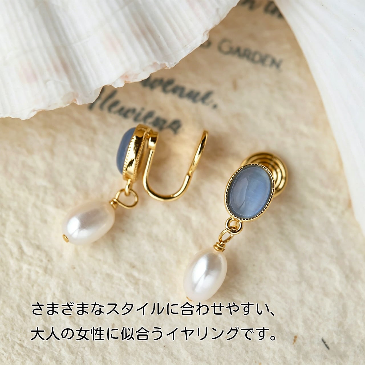 P29 .アクアマリン&淡水パール蚊香型イヤークリップ|フレンチスタイル・清楚で爽やか・ノンホールイヤリング・夏用