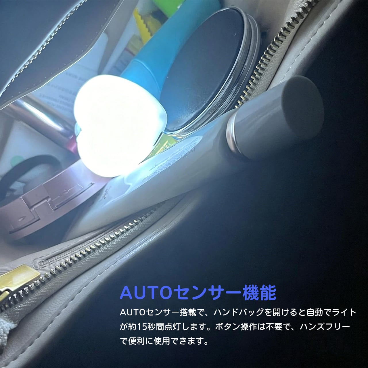 バッグを開けたり、ライト本体をタッチするだけで瞬時に点灯。暗闇で手探りする必要がなく、片手でも簡単に操作できます。