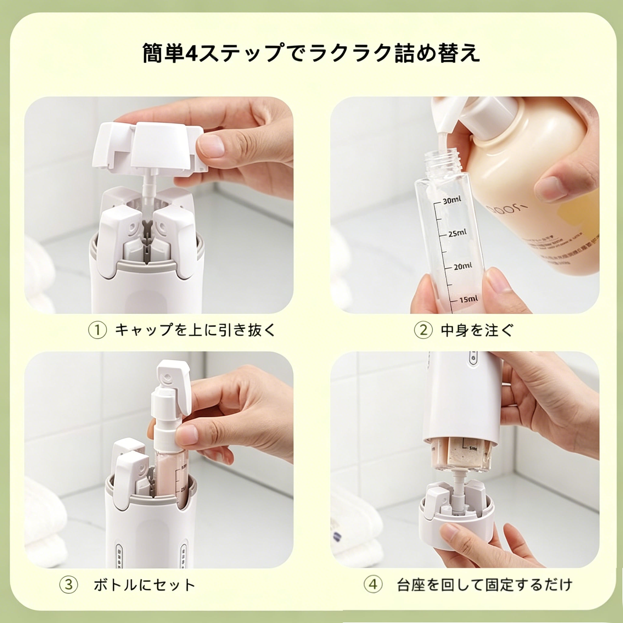 J50 .4in1トラベルボトルセット ポータブルプッシュ式ディスペンサー シャンプー・化粧水・乳液対応/旅行用詰め替え容器
