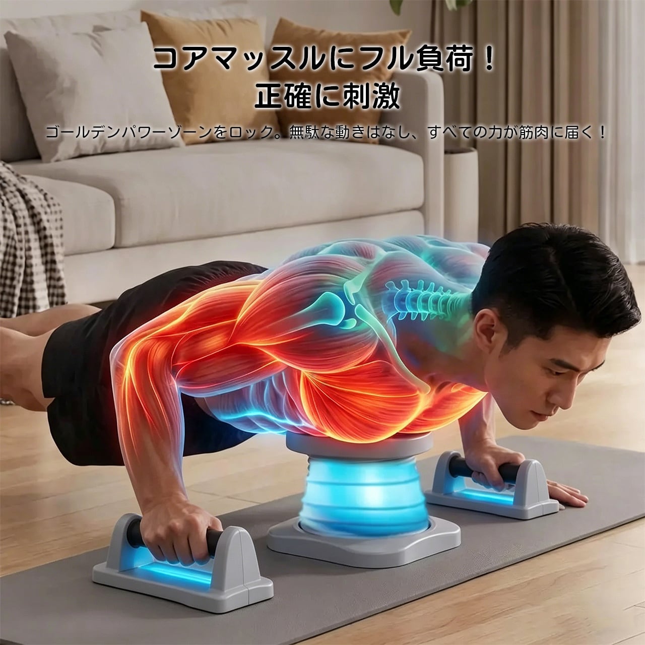 強力スプリングがプッシュアップの動作をサポートし、腹筋・胸筋・肩筋・腕の筋肉に全負荷をかけます。