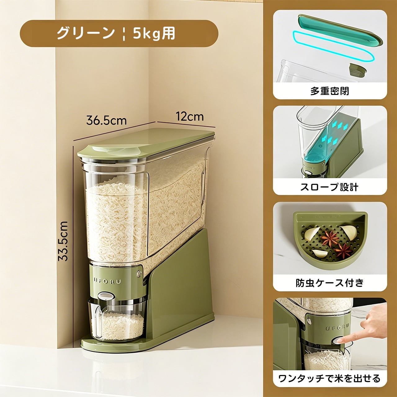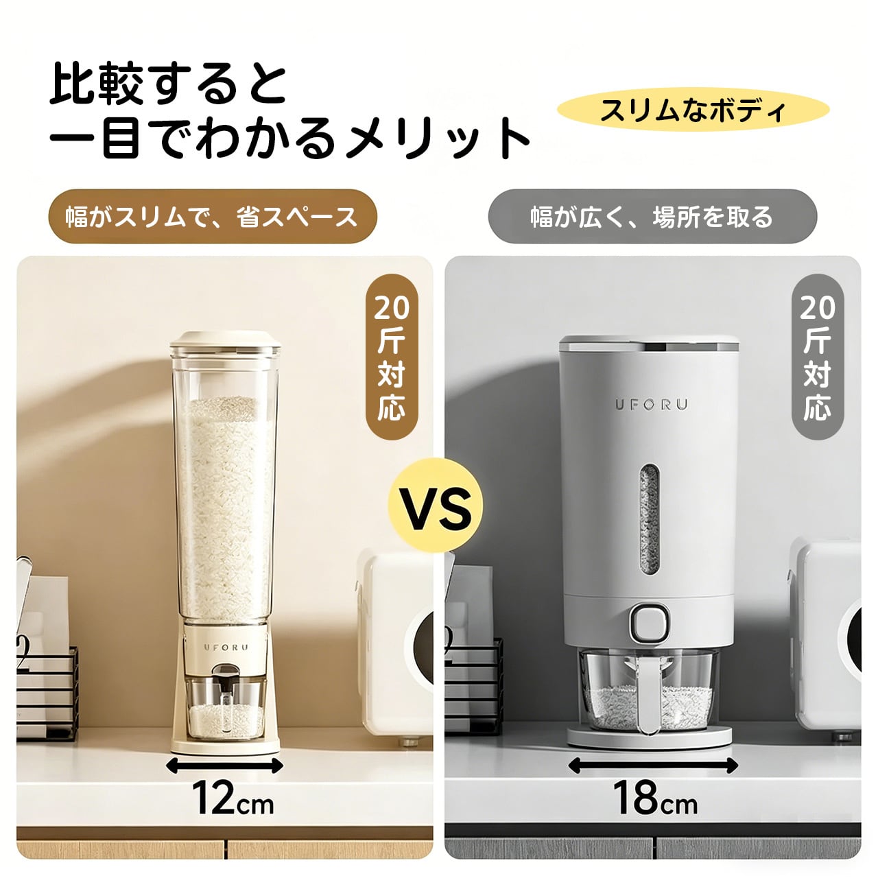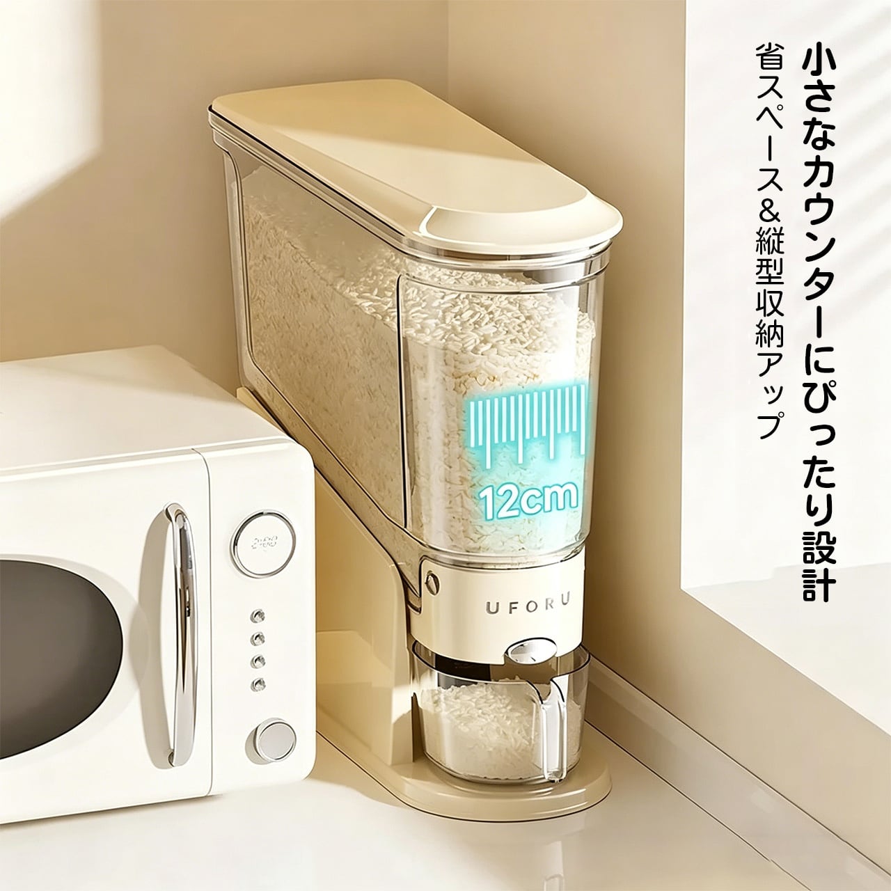 狭いキッチンでもすっきり設置できる押し出し式米びつ。多重密閉で湿気や虫から守り、ワンタッチで米をスムーズに取り出せます。食品級素材使用で安心、付属の計量カップで毎回定量も簡単。5kg・10kgのサイズ展開で、一人暮らしから大家族まで対応可能です。重ね置きもでき、収納効率もアップ。