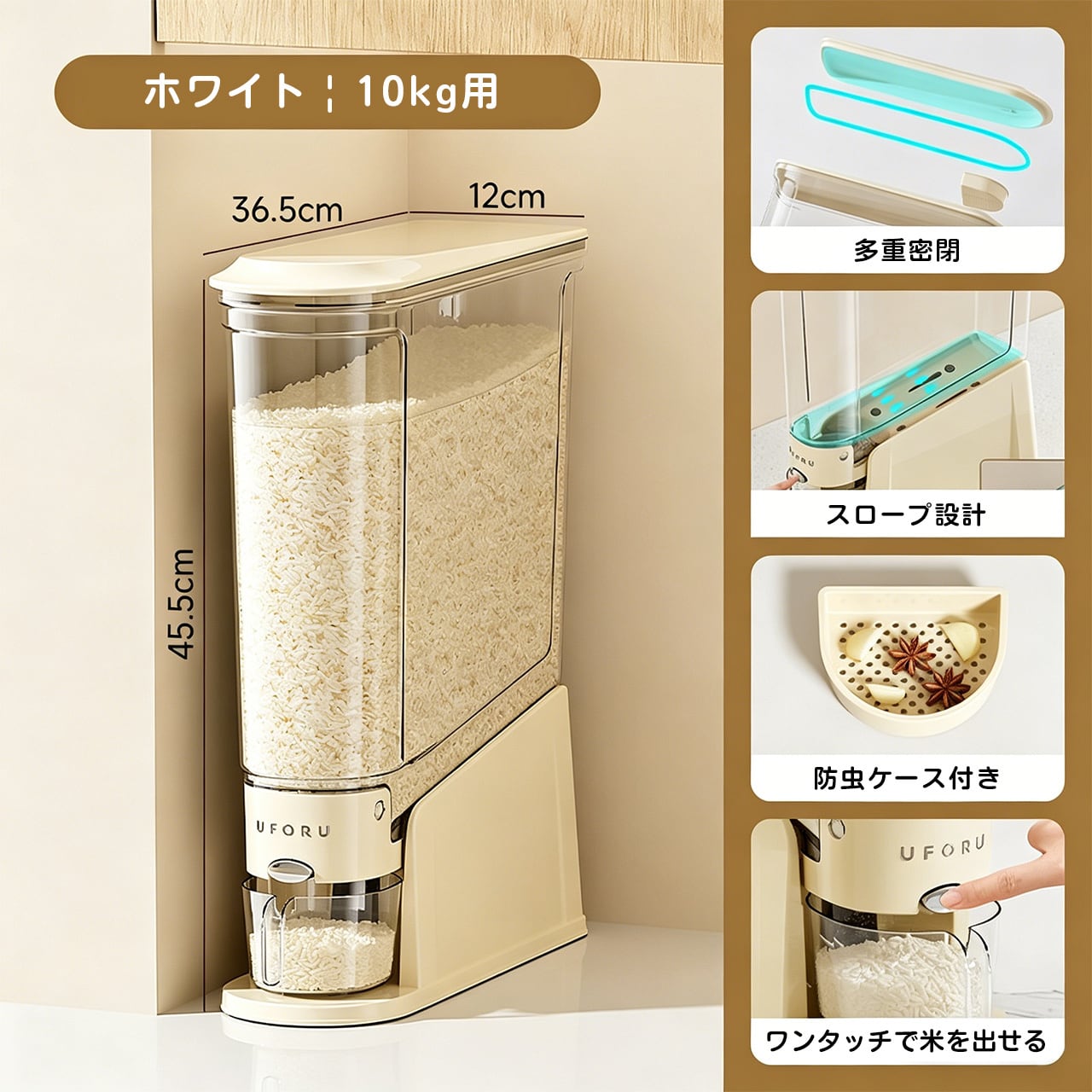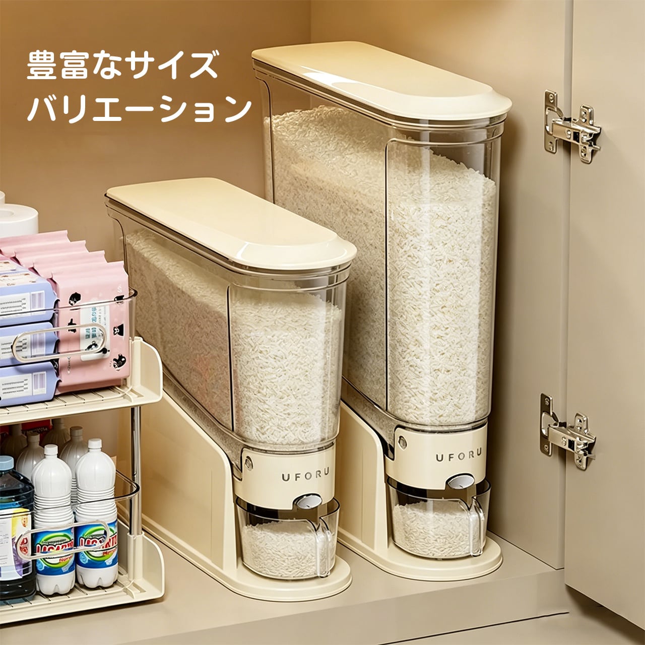 10kgサイズで大量の米も安心保管。重ね置きも可能で収納効率アップ。