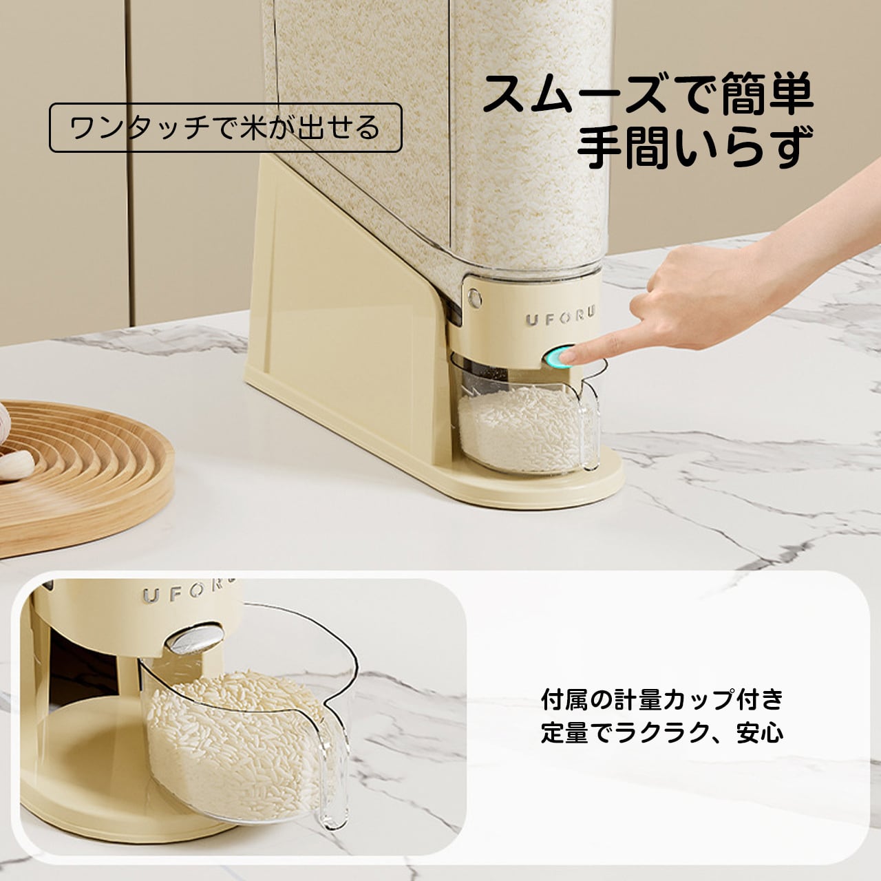 片手で簡単に米を取り出せる押圧式設計。重い米袋を持ち上げる必要がなく、毎日の炊飯がスムーズで快適になります。