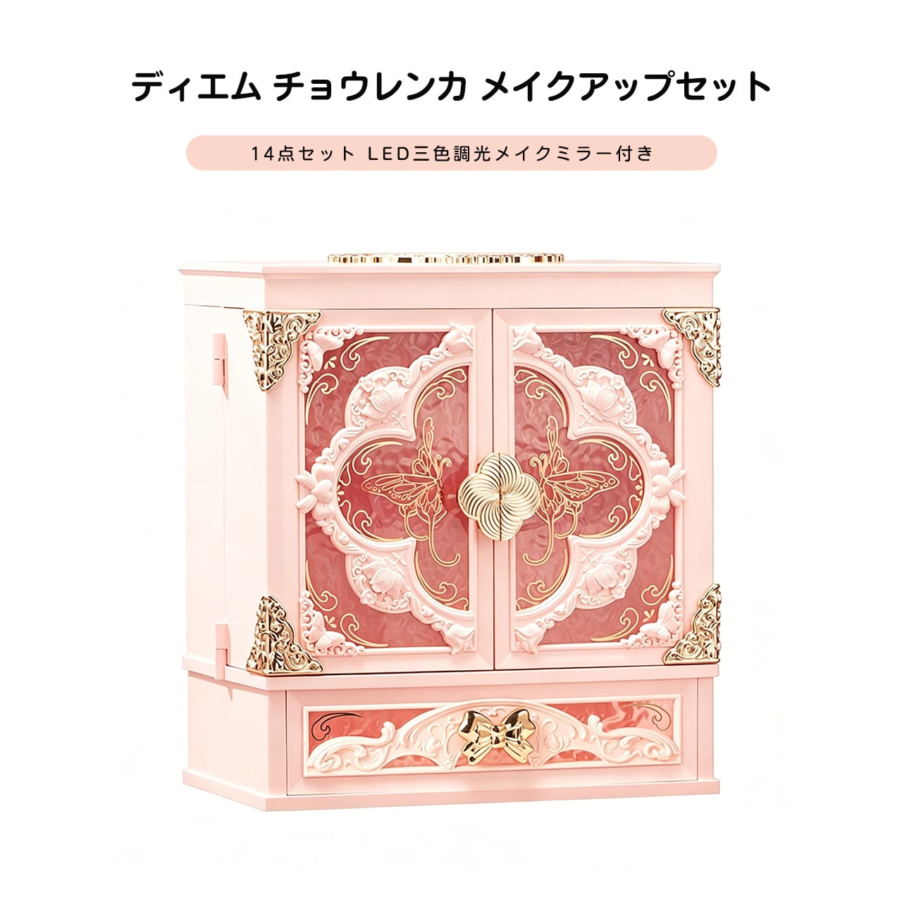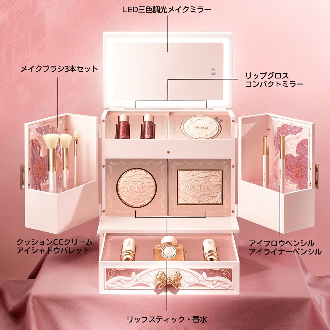 口紅、リップグロス、CCクッション、アイシャドウ、眉ペン、アイライナー、メイクブラシまで、メイクに必要なアイテムがすべて揃った豪華セット。